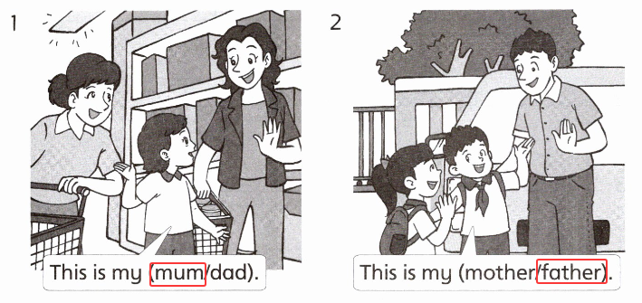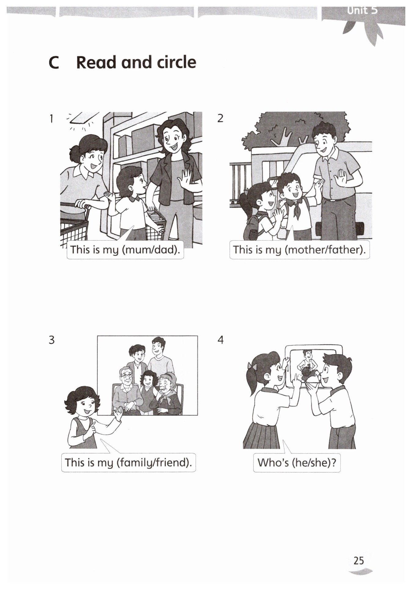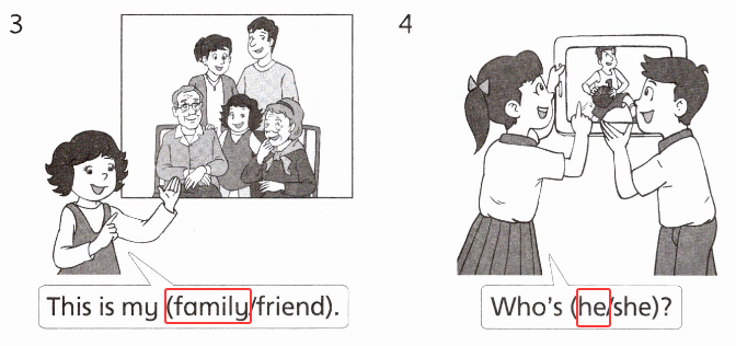 這是一道英語閱讀理解題目,考查學(xué)生對(duì)家庭成員稱呼的掌握情況,以及根據(jù)圖片內(nèi)容選擇正確詞匯的能力。解題方法是根據(jù)圖片中人物的關(guān)系,結(jié)合題目所給的詞匯選項(xiàng),圈出正確的單詞。