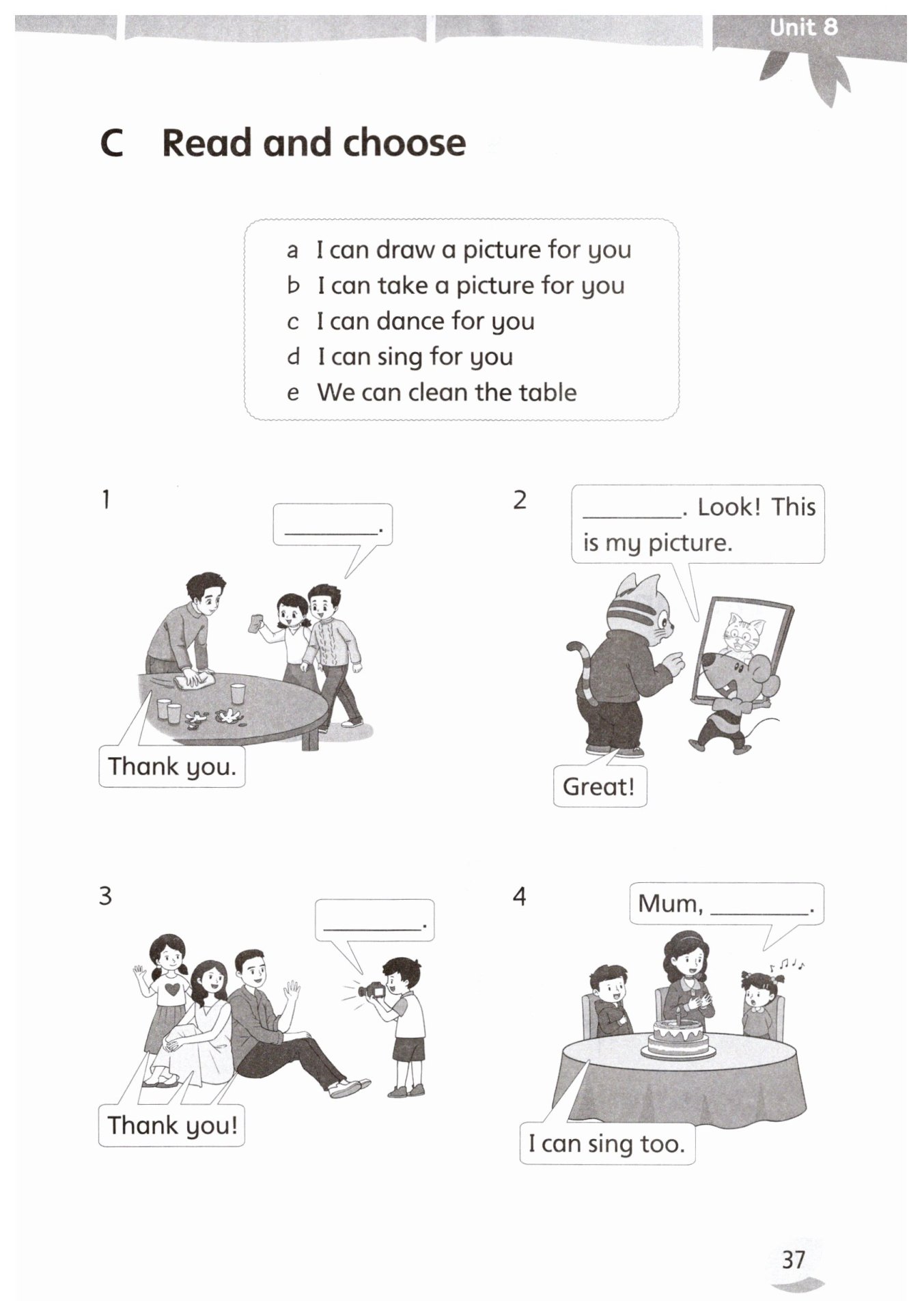 4. 第四幅圖中孩子說“I can sing too.”(我也可以唱歌。),對(duì)應(yīng)選項(xiàng)d“I can sing for you”(我可以為你唱歌)。