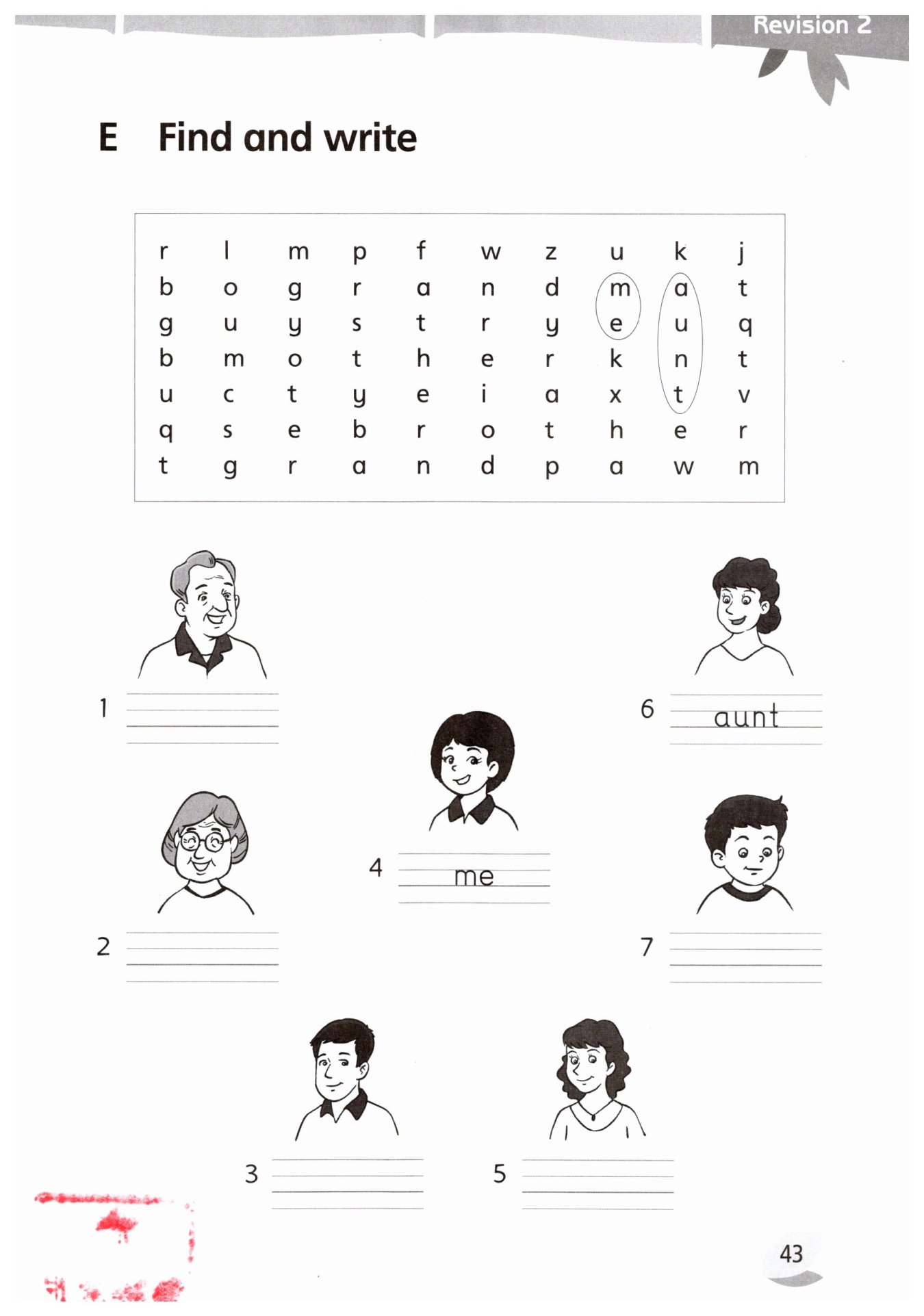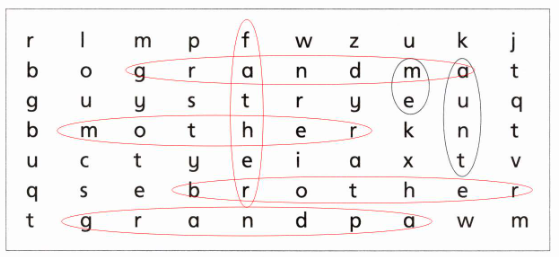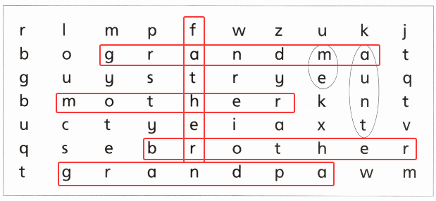 這是一道英語詞匯匹配題,考查學(xué)生對家庭成員相關(guān)詞匯的掌握以及字母拼寫能力。解題的關(guān)鍵在于識別圖片中的人物身份,然后從上方字母矩陣中找出對應(yīng)的英文單詞并正確書寫。