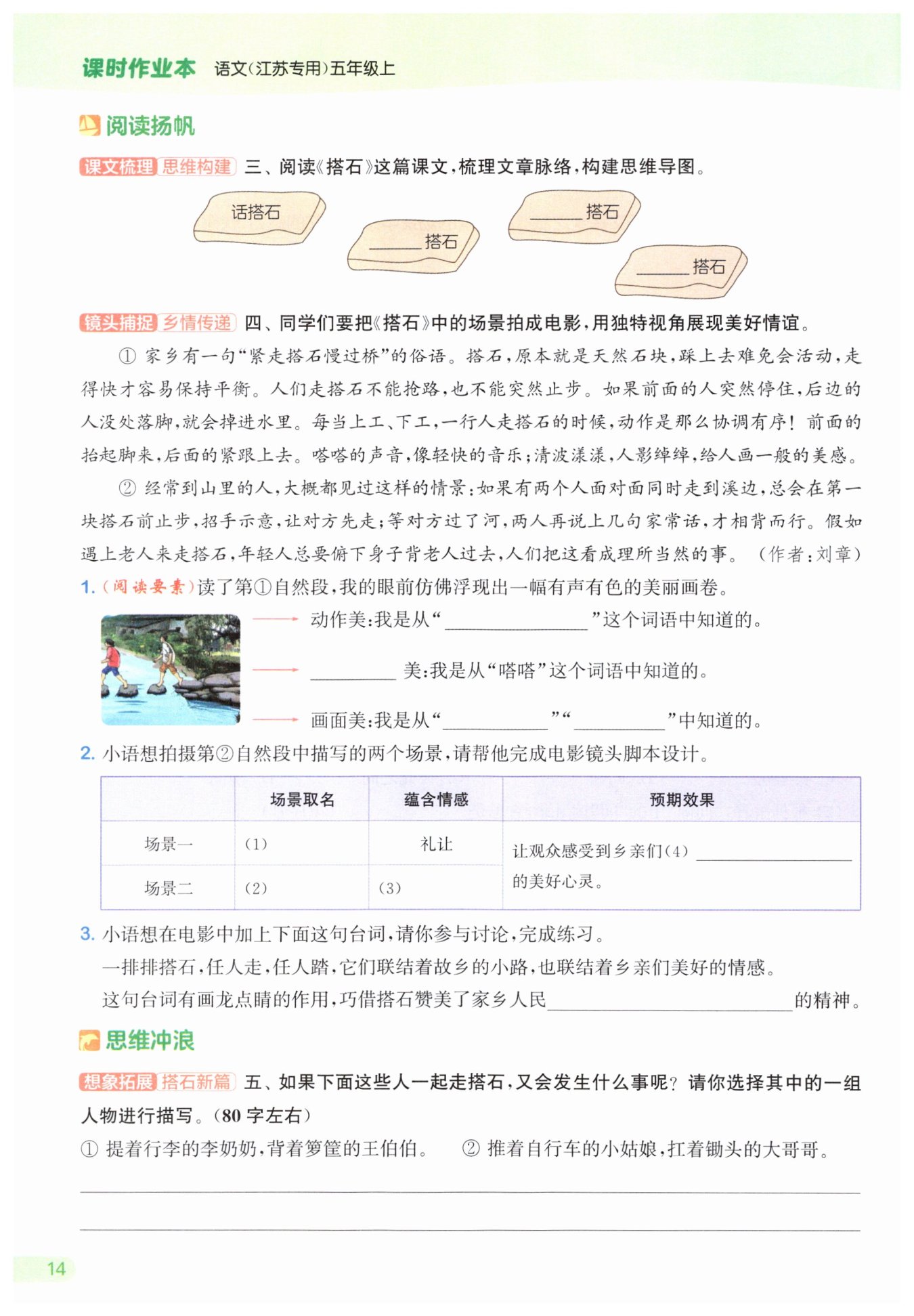 示例:推著自行車的小姑娘站在搭石前,眉頭緊鎖,不知如何是好。扛著鋤頭的大哥哥
