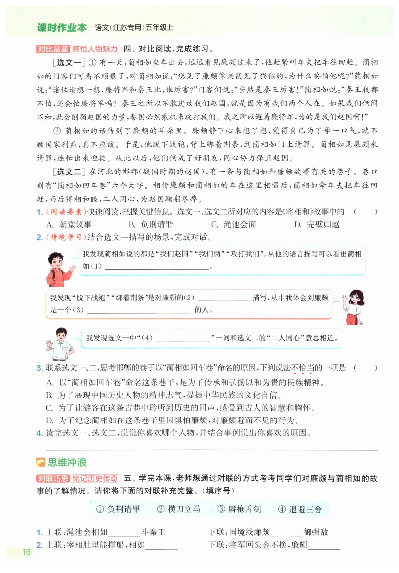 示例一:我喜歡藺相如,因?yàn)樗恍臑閲?,以國家利益為重,顧全大局?示例二:我喜歡廉頗,因?yàn)樗掠谡J(rèn)錯(cuò)、知錯(cuò)就改。