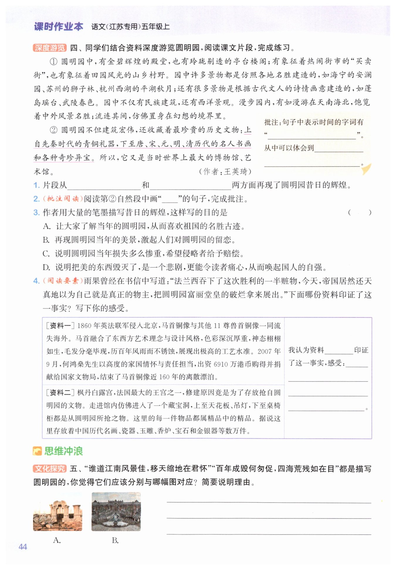 A圖對(duì)應(yīng)“百年成毀何匆促,四海荒殘如在目”。在A圖中我們看到的只有殘?jiān)珨啾冢黄臎?。這兩句描述了圓明園被毀后的荒涼,讓人無比痛惜。B圖對(duì)應(yīng)“誰(shuí)道江南風(fēng)景佳,移天縮地在君懷”。B圖展示的是圓明園昔日的輝煌。這兩句正是對(duì)圓明園吸納江南園林風(fēng)情,集南北園林藝術(shù)之大成的贊美。