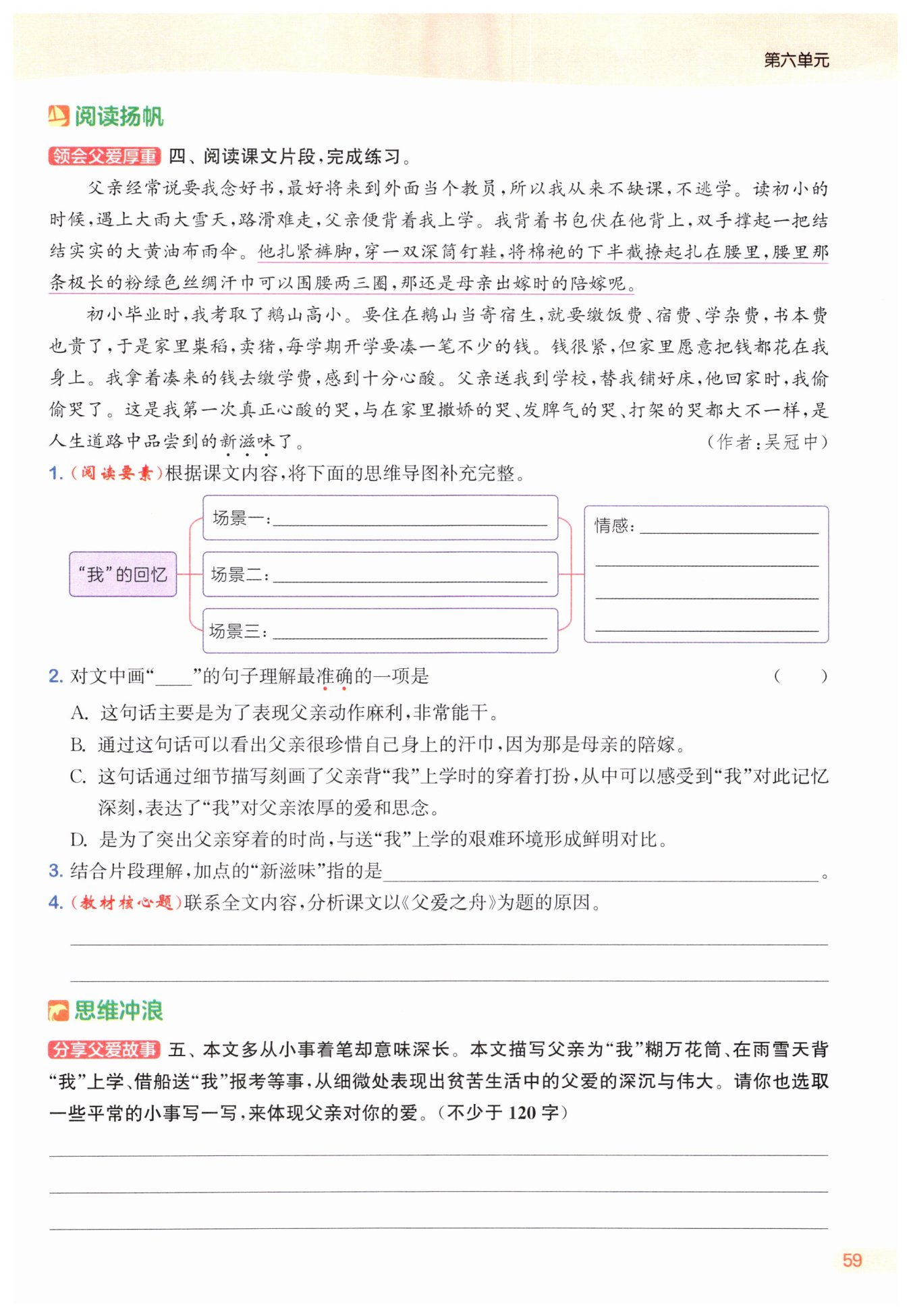 期望和深沉的愛,是人生之舟、希望之舟、愛之舟。以《父愛之舟》為題既揭示了課文的主題,也承載著“我”對(duì)父親的思念。