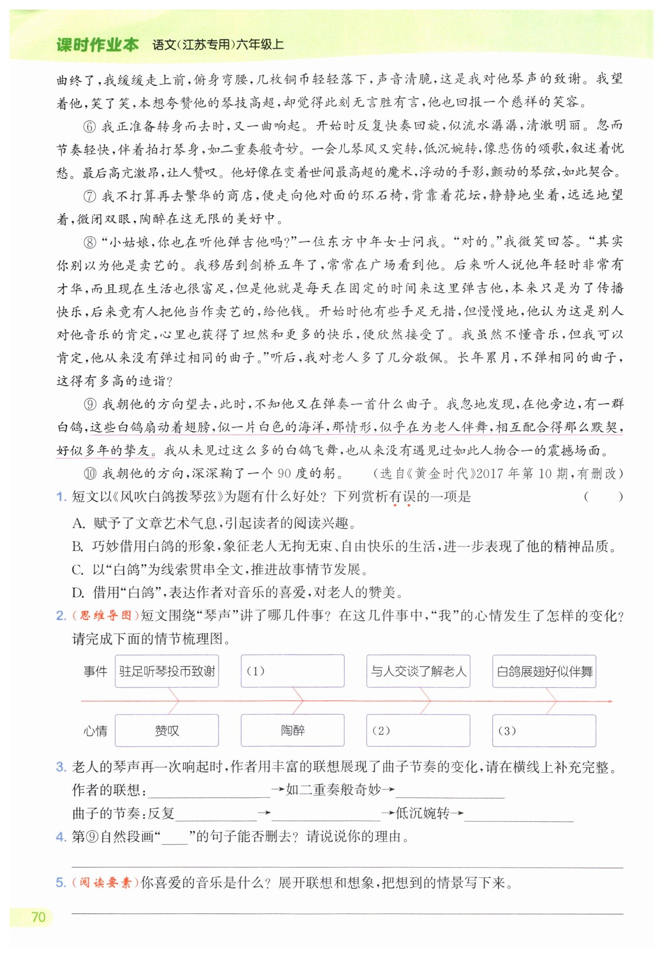 不能刪去。這處描寫渲染了倫敦鴿子廣場因老人的演奏而產(chǎn)生的和諧、快樂的氣氛,烘托了老人通過彈奏樂曲傳播快樂的效果,表達了作者對老人的敬佩和贊美之情。
