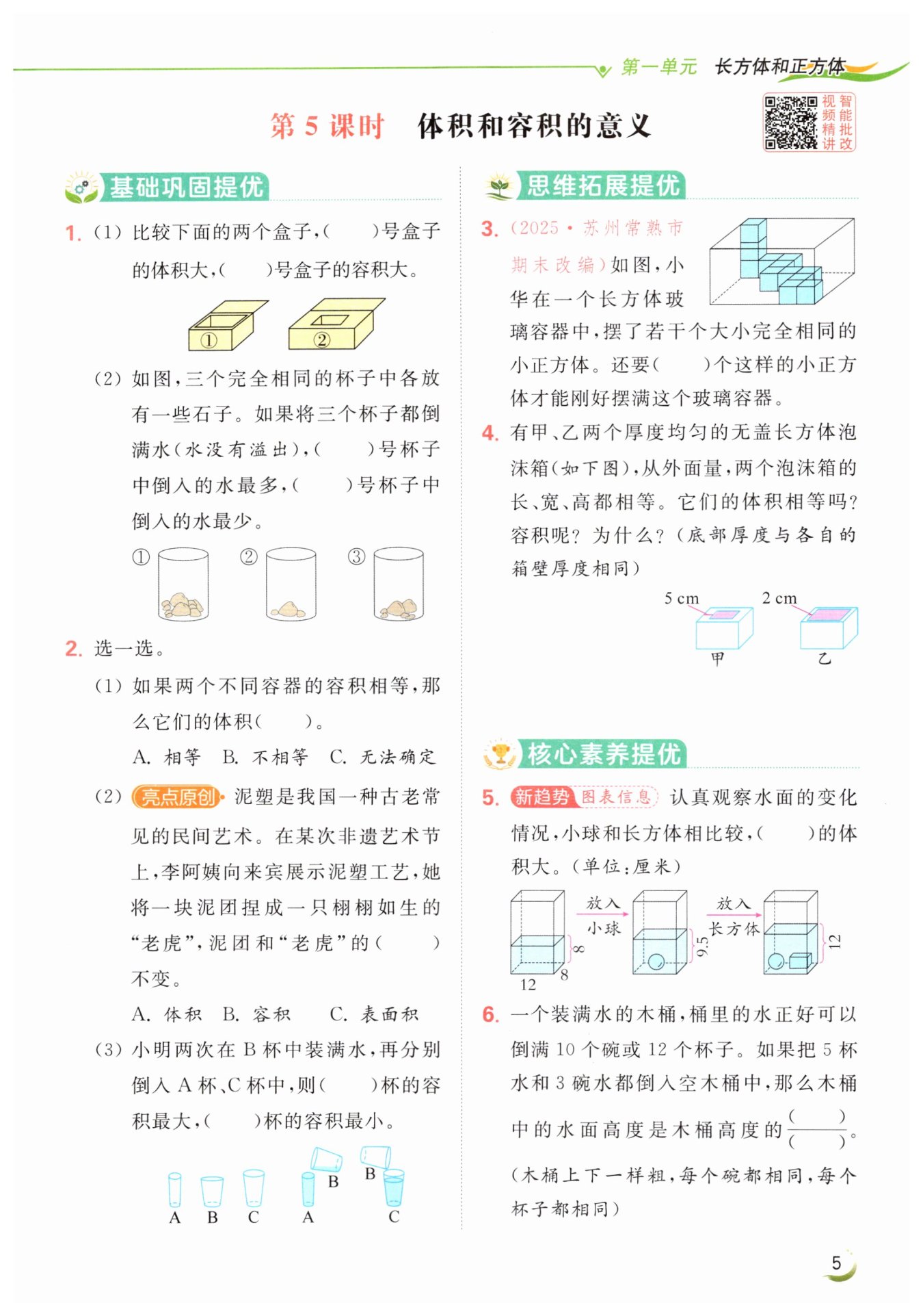 答:體積相等,因?yàn)閺耐饷媪?,兩個(gè)泡沫箱的長、 寬、高都相等 乙泡沫箱的容積大一些,因?yàn)榧着菽涞南浔诤褚恍詮睦锩媪?,甲泡沫箱的長、寬、高都比乙泡沫箱短一些,因此乙泡沫箱的容積要比甲泡沫箱大一些