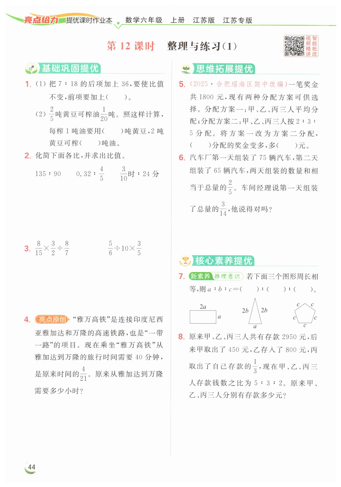 丙:$3300\times\frac{3}{5 + 3 + 3}=900$(元)