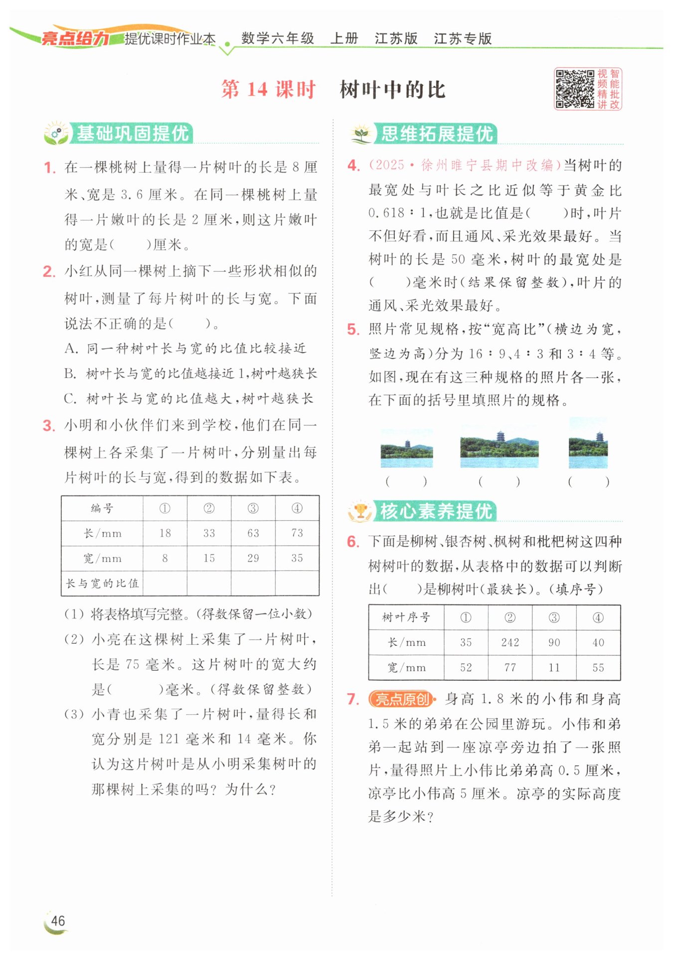 $121\div14\approx8.6,$我認(rèn)為這片樹(shù)葉不是從小明采集樹(shù)葉的那棵樹(shù)上采集的。因?yàn)檫@片樹(shù)葉長(zhǎng)與寬的比值遠(yuǎn)遠(yuǎn)大于小明所采集樹(shù)葉的長(zhǎng)與寬的比值。