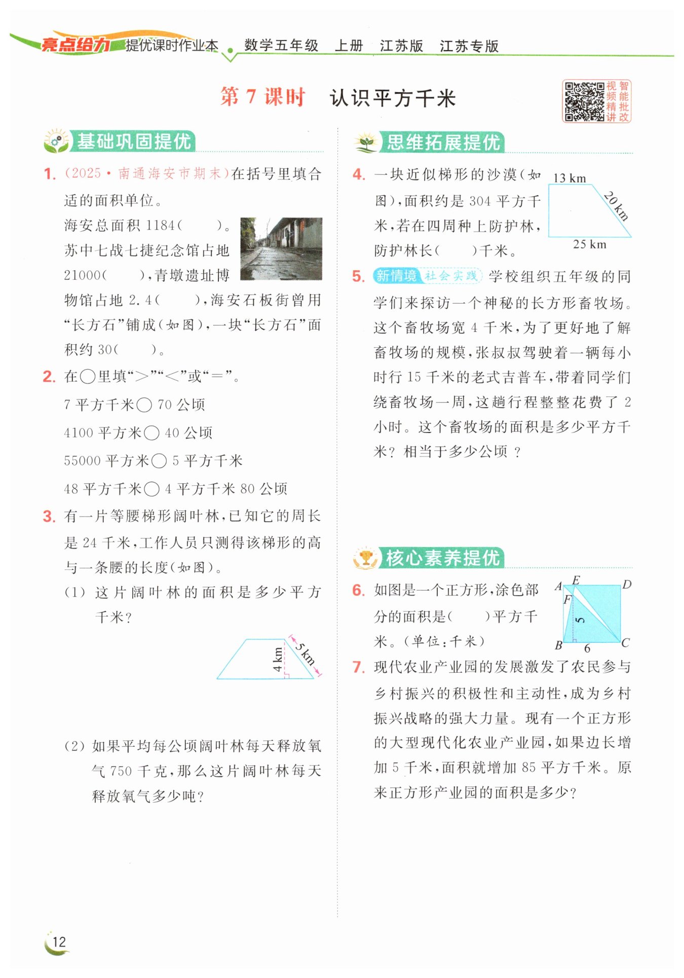 那么兩個(gè)長(zhǎng)方形的面積和為$85 - 25 = 60$平方千米,一個(gè)長(zhǎng)方形面積為$60÷2 = 30$平方千米。