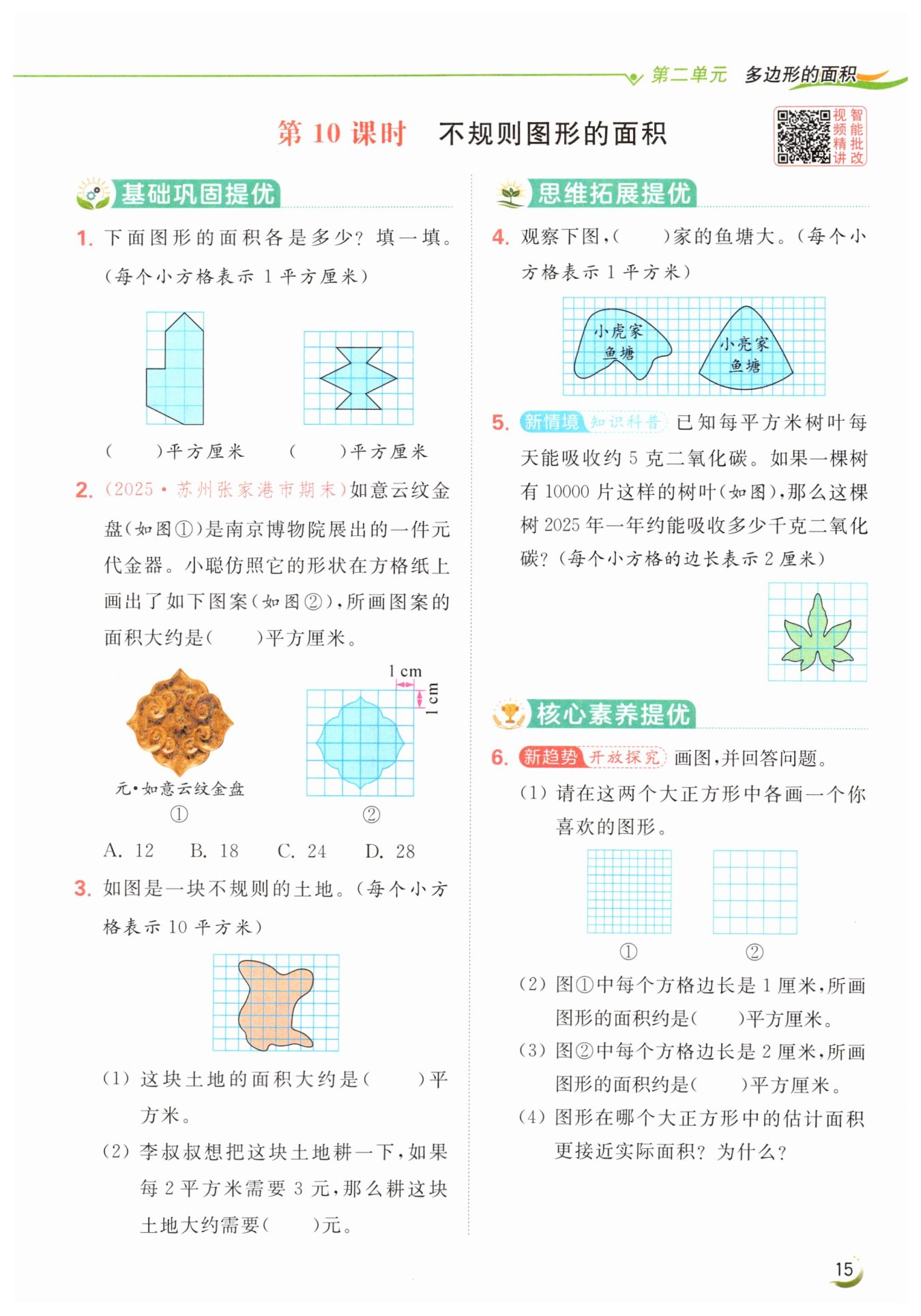 答:圖形在第①個(gè)大正方形中的估計(jì)面積更接近實(shí)際面積,因?yàn)榉殖傻男》礁駭?shù)越多,每個(gè)小方格的面積就越小,估算出的面積就越精確。