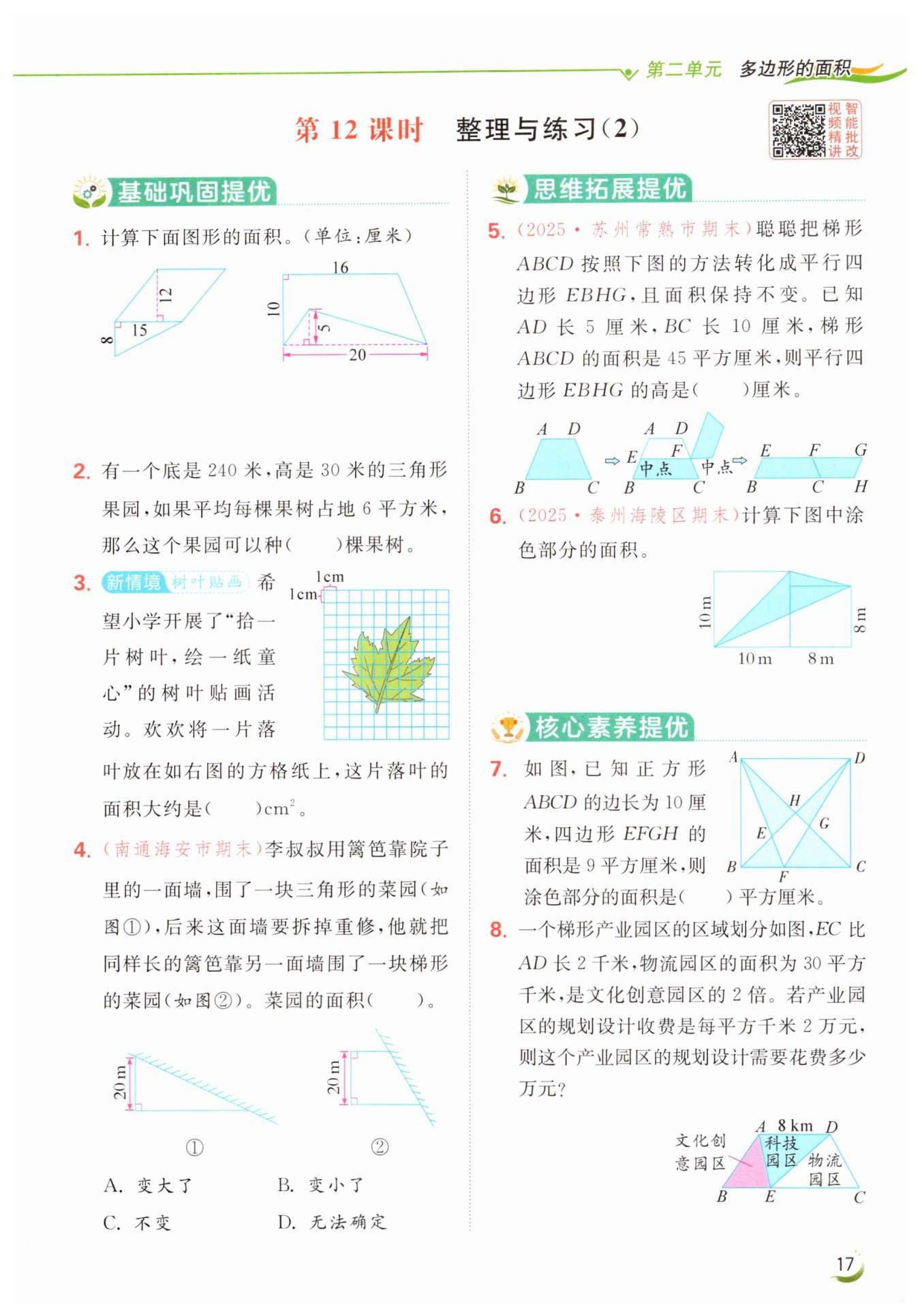 $\begin{aligned}&8×15÷2 + 15×12\\=&60 + 180\\=&240(平方厘米)\end{aligned}$