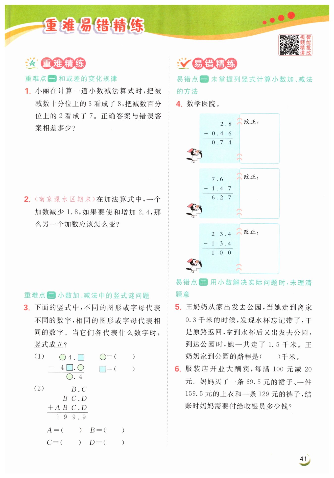 減數(shù)百分位上的$2$看成了$7,$則差減少了$0.07 - 0.02 = 0.05;$