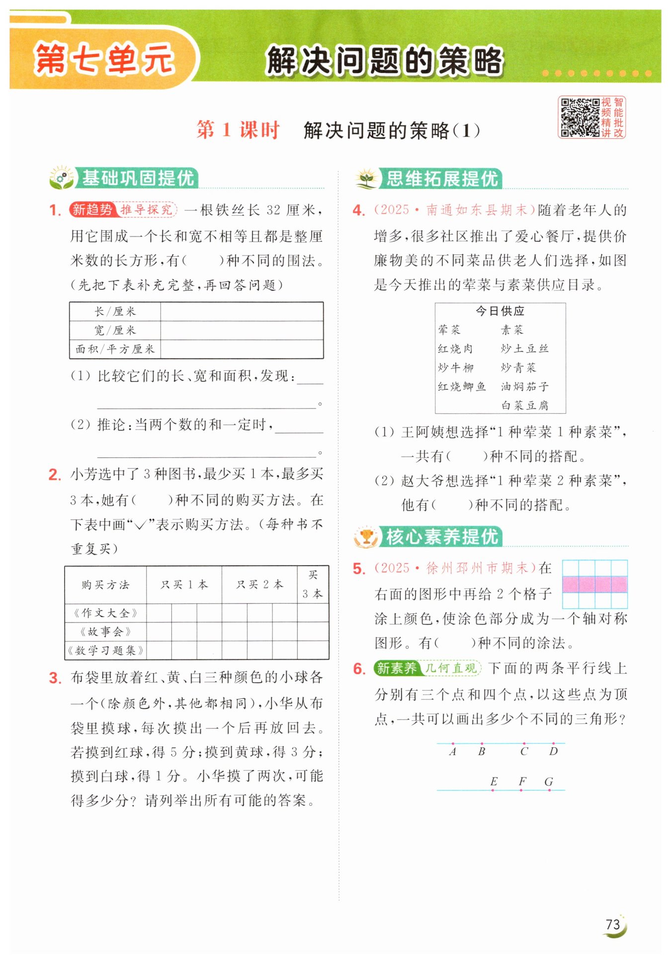 上面的直線上共有$3 + 2 + 1 = 6$(條)線段,所以以這條直線上的線段為底,分別以點(diǎn)$E$、點(diǎn)$F$、點(diǎn)$G$為頂點(diǎn),每條底邊各能畫出$3$個(gè)不同的三角形;下面的直線上共有$2 + 1 = 3$(條)線段,所以以這條直線上的線段為底,分別以點(diǎn)$A$、點(diǎn)$B$、點(diǎn)$C$、點(diǎn)$D$為頂點(diǎn),每條底邊各能畫出$4$個(gè)不同的三角形。所以一共可以畫出$6×3 + 3×4 = 30$(個(gè))不同的三角形。