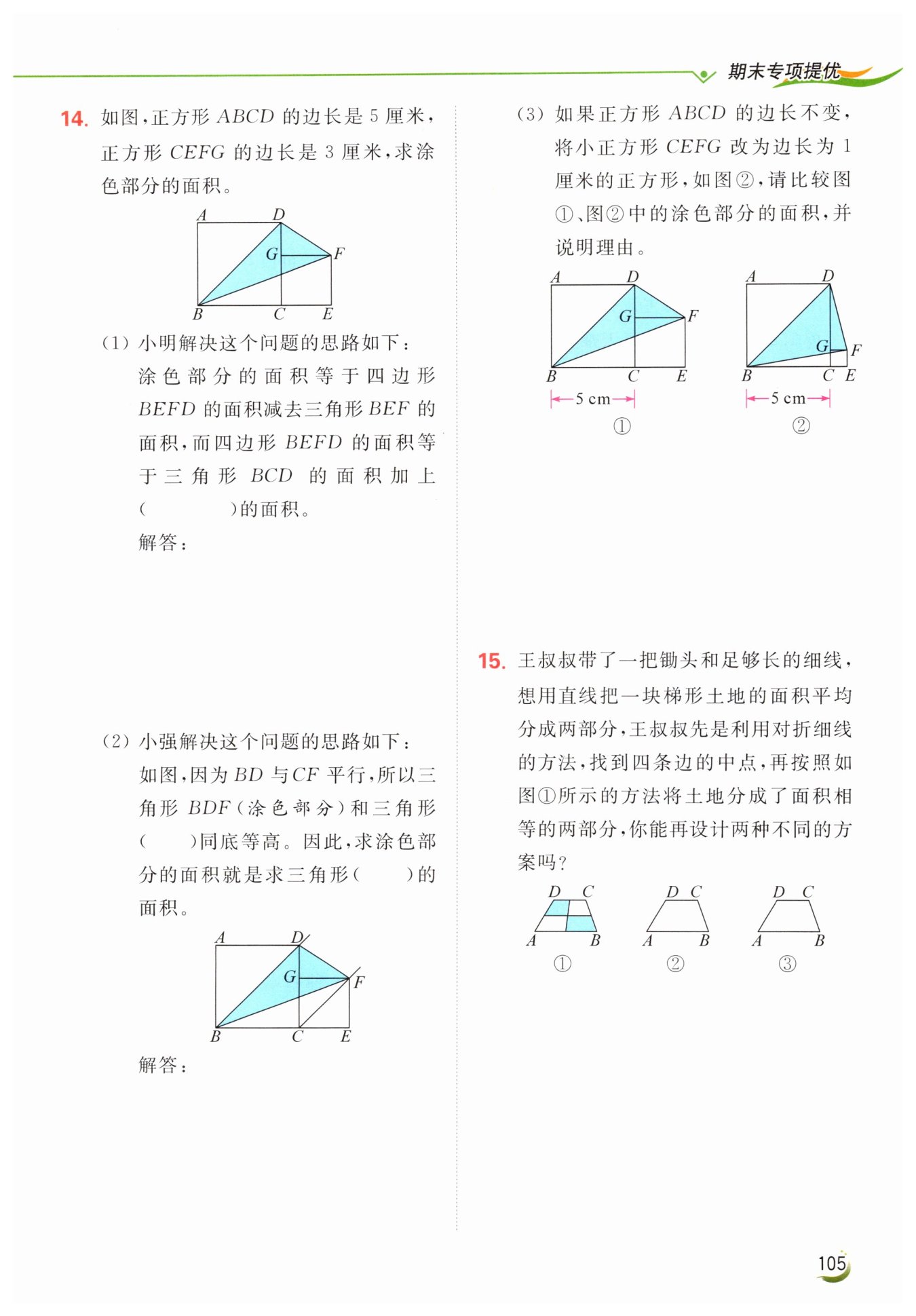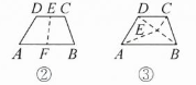 答案合理即可,示例如下。方案一:如圖②,設(shè)梯形上、下底的中點(diǎn)分別為$E$、$F,$連接$EF,$則四邊形$AFED$的面積 = 四邊形$FBCE$的面積 = 梯形$ABCD$的面積÷$2。$方案二:如圖③,連接$BD,$取$BD$的中點(diǎn)$E,$連接$AE$、$EC。$因?yàn)?BE = DE,$所以三角形$ABE$的面積 = 三角形$ADE$的面積,三角形$CBE$的面積 = 三角形$CDE$的面積,三角形$ABE$的面積 + 三角形$CBE$的面積 = 三角形$ADE$的面積 + 三角形$CDE$的面積,所以四邊形$ABCE$的面積 = 四邊形$AECD$的面積 = 梯形$ABCD$的面積÷$2。$