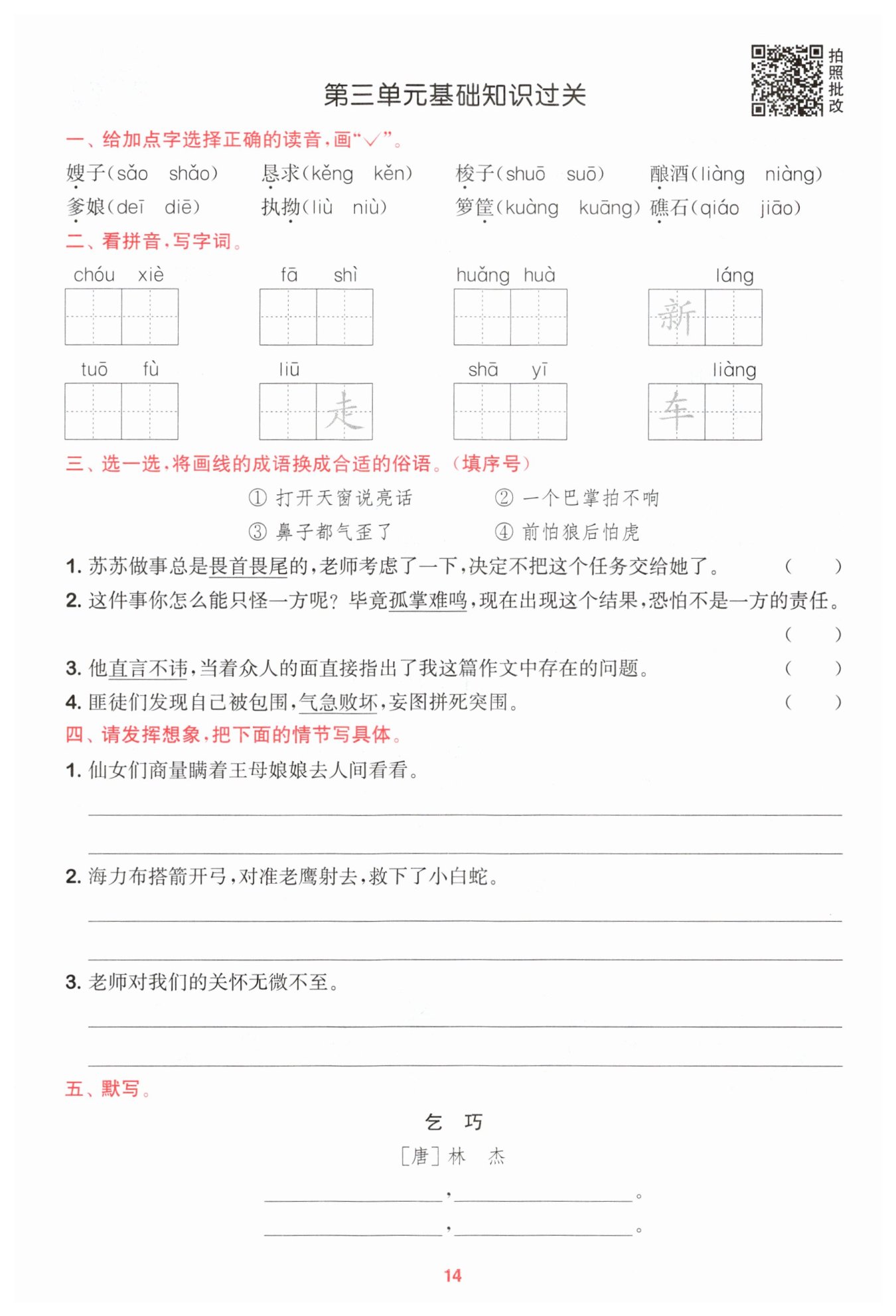 示例:海力布看到老鷹抓著小白蛇飛過,忙搭箭開弓,對準老鷹。嗖的一聲,箭