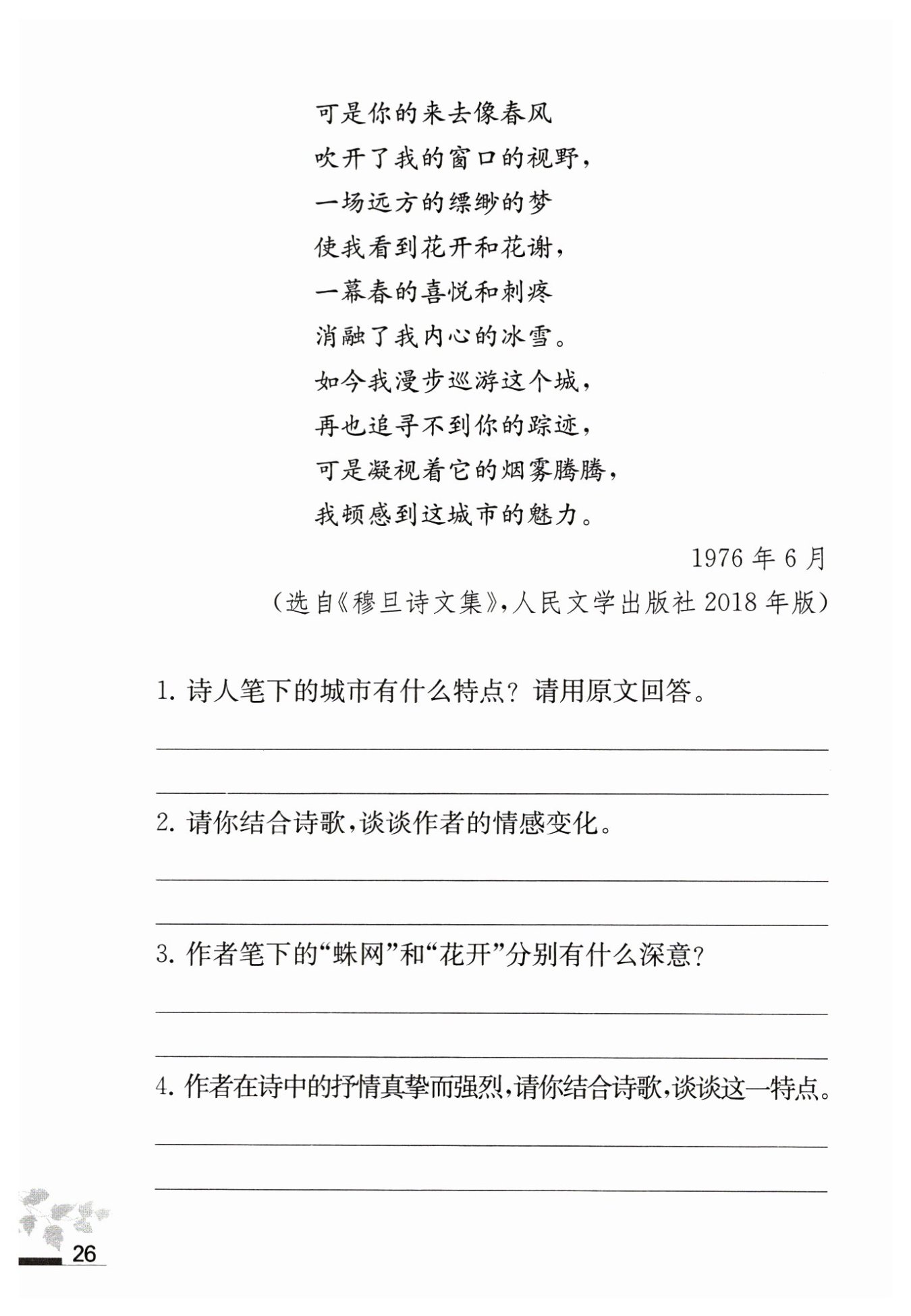 作者用“蛛網(wǎng)”來比喻城市中的生活和人際關(guān)系,表達(dá)自己深陷城市的困頓和壓抑,心中充滿了煩惱?!盎ㄩ_”比喻見到“你”之后內(nèi)心的感情,心中有了喜悅和希望。