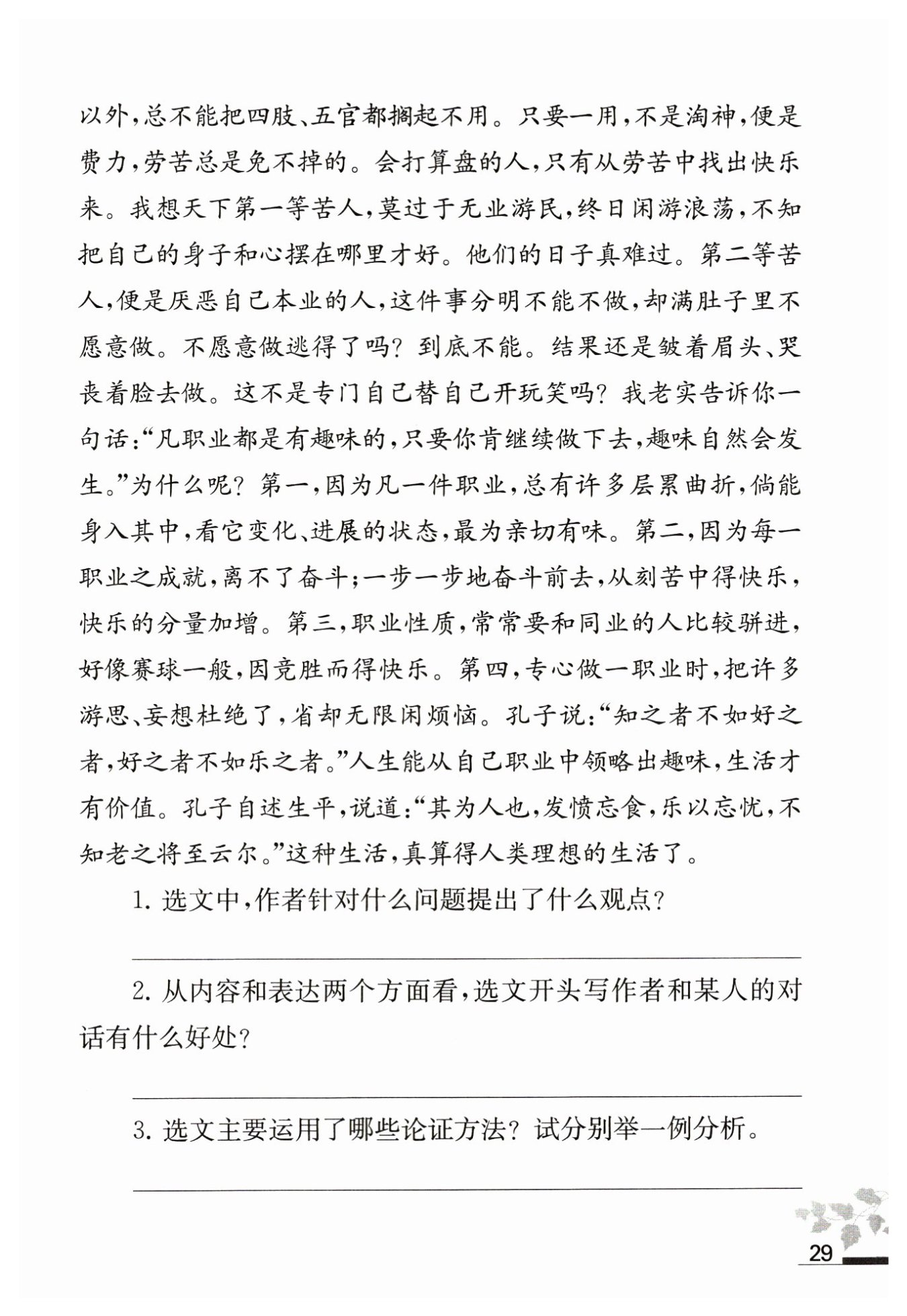 內(nèi)容上:借生活小事引出要說(shuō)明的道理:凡職業(yè)都是有趣味的,只要你肯繼續(xù)做下去,趣味自然會(huì)發(fā)生。表達(dá)上:采用對(duì)話(huà)方式親切平易,如話(huà)家常,便于交流,容易產(chǎn)生共鳴。