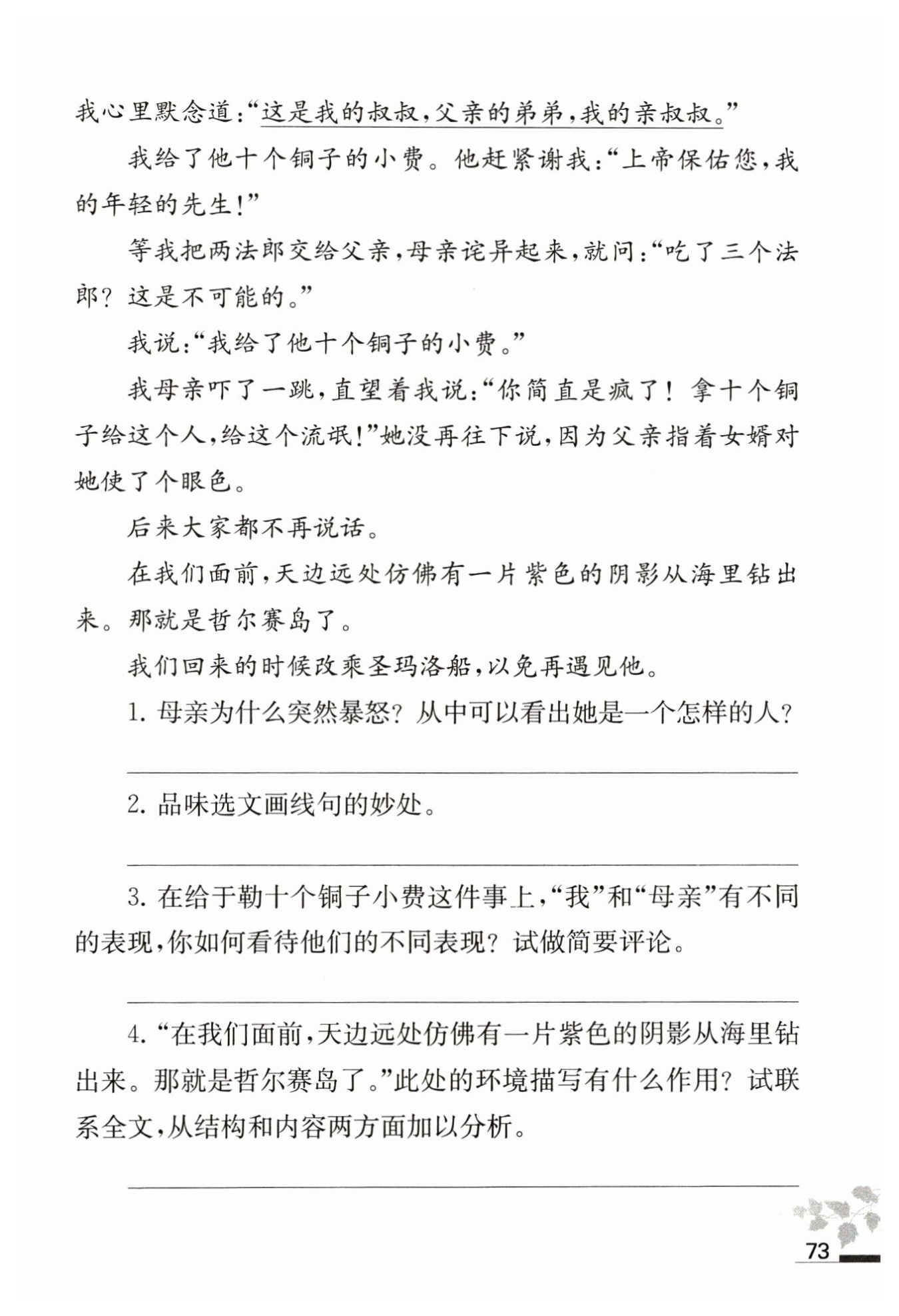 此處的環(huán)境描寫在結構上與上文乘船旅行時看到大海的美麗景色相呼應,并形成對比;在內容上襯托了菲利普夫婦一家因船上遇到窮困潦倒的于勒,希望改變家庭狀況的愿望破滅后內心沮喪、絕望的心情。與開始旅行的歡快心情形成對比。