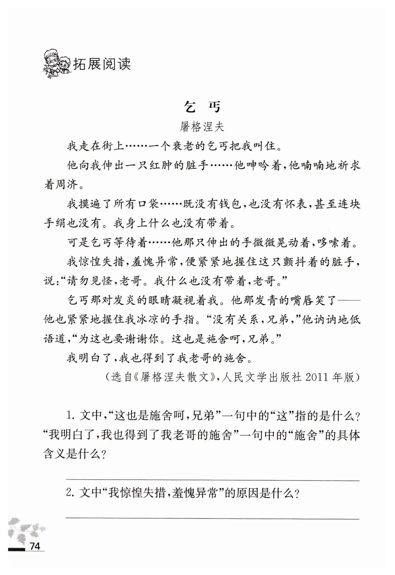 一份精神上的慰勉和關(guān)切。“施舍”的具體含義是:乞丐對“我”給
