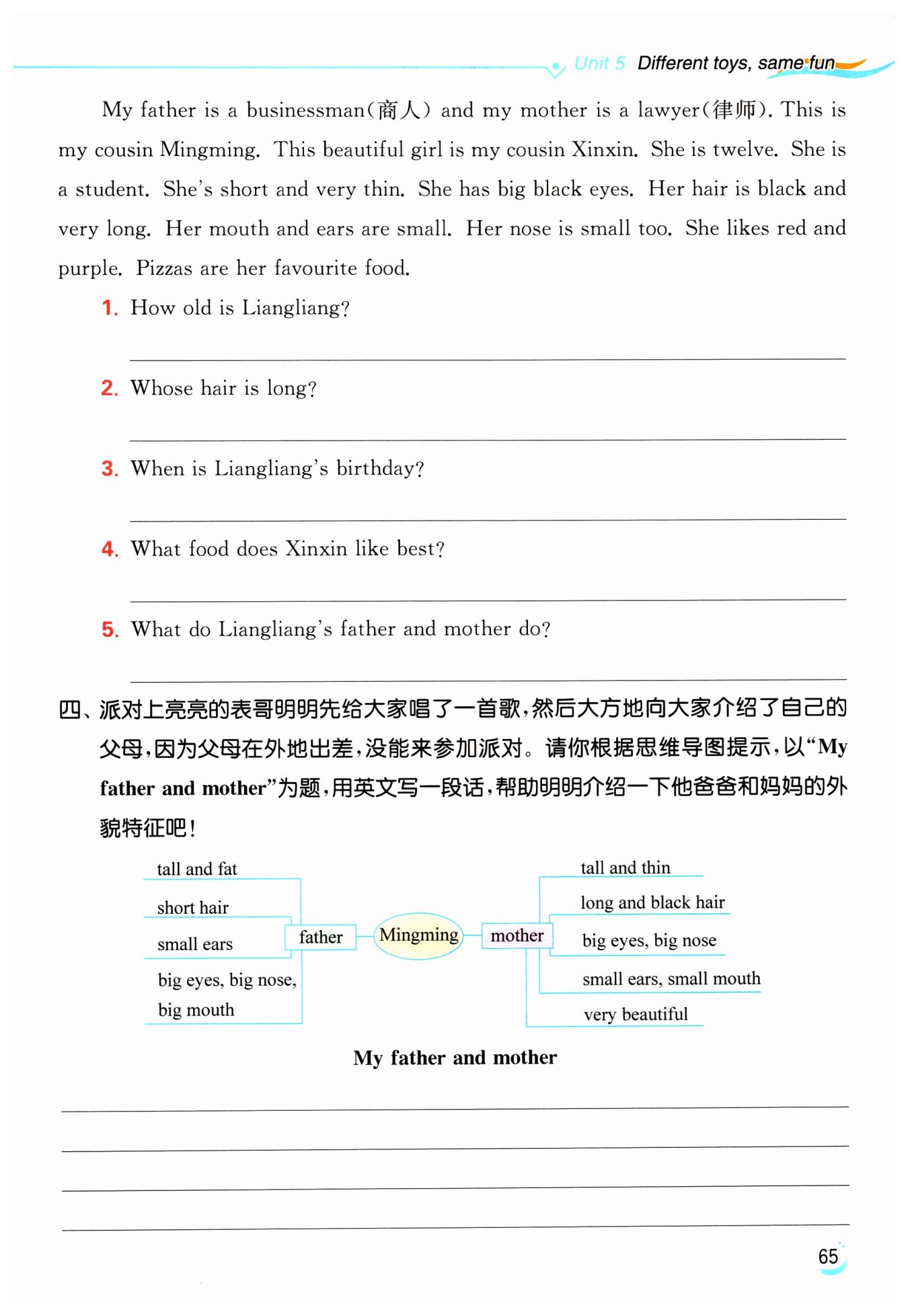 is big, and his mouth is big too. My mother is tall and thin. Her hair is long and black. Her