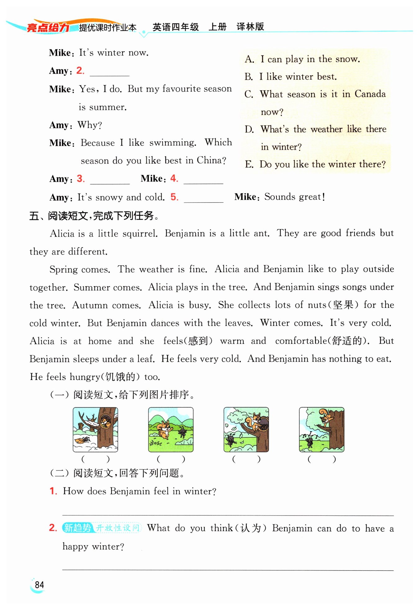I think he can learn from Alicia, collect lots of food in autumn and make a warm home for winter. (答案不唯一)