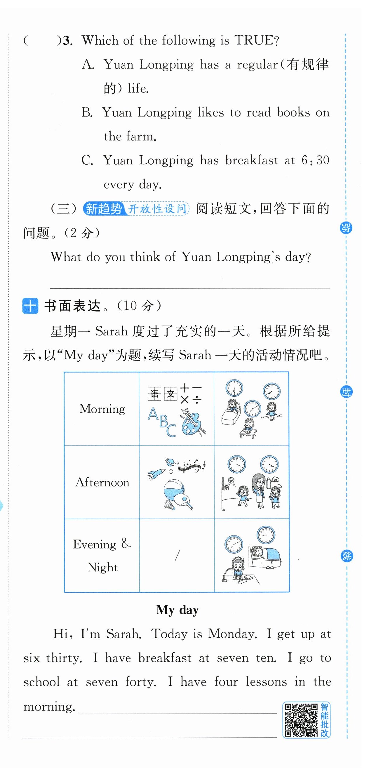 In the afternoon, I have three lessons. They are Science, Music and PE. I go to the sports ground at four. I usually go home at four twenty. In the evening, I do my homework at seven ten and go to bed at nine.