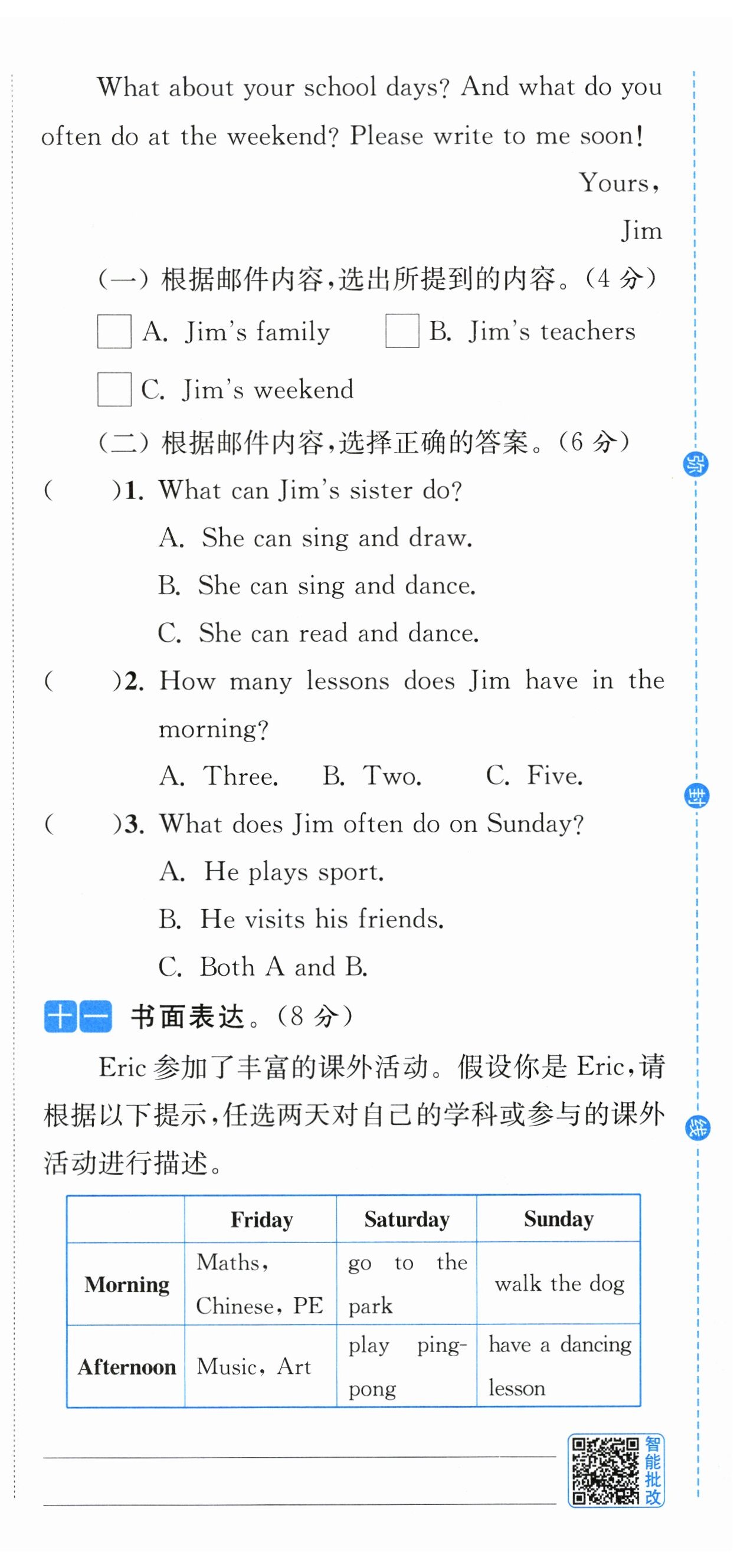 I have Maths, Chinese and PE on Friday morning. In the afternoon, I have Music and Art. I don't have any lessons at school on Sunday. I walk my dog in the morning. And I have a dancing lesson in the afternoon. I have a good time.