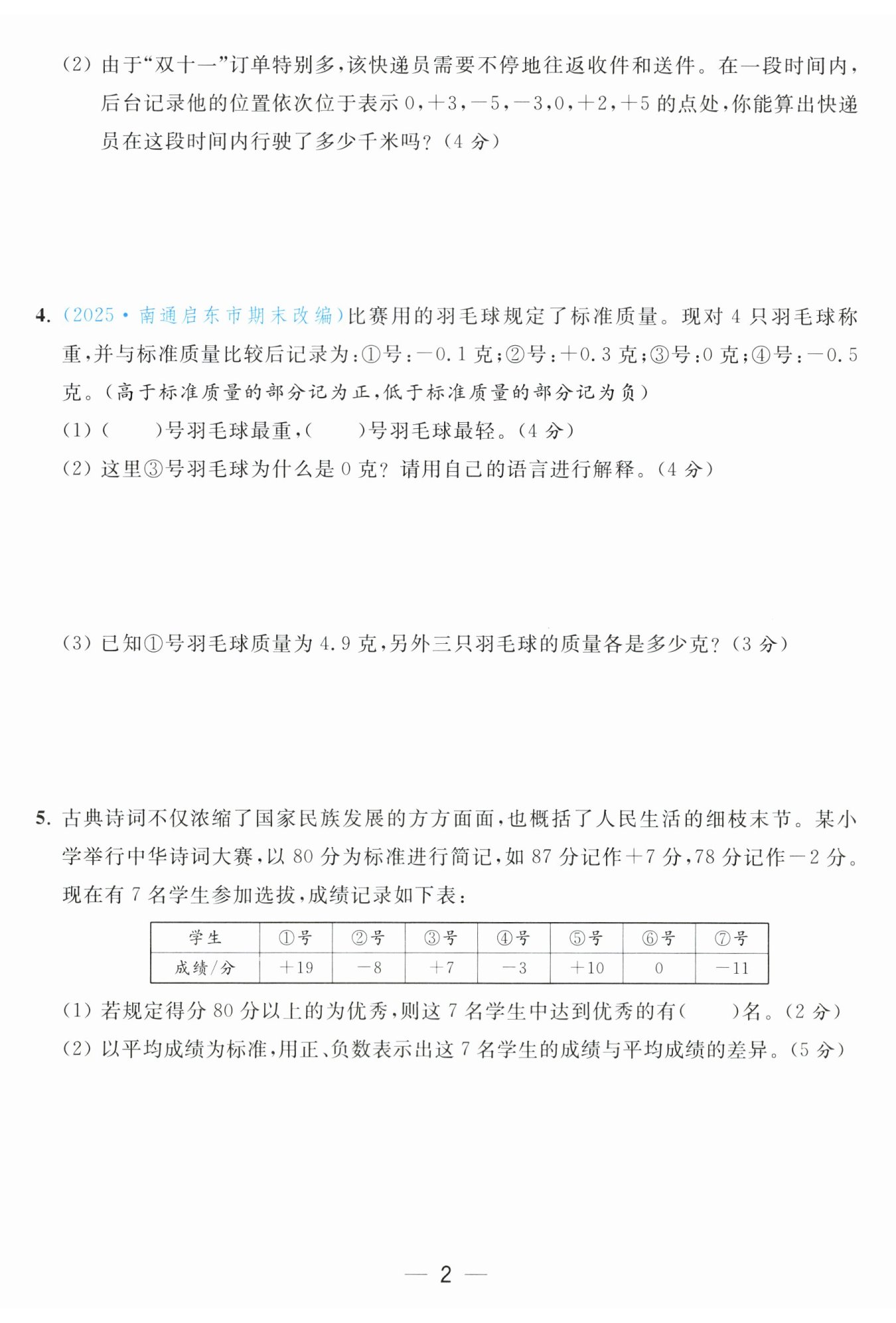 平均成績(jī):$(19 + 7 + 10 - 8 - 3 - 11)\div7 = 2$(分),$2 + 80 = 82$(分)