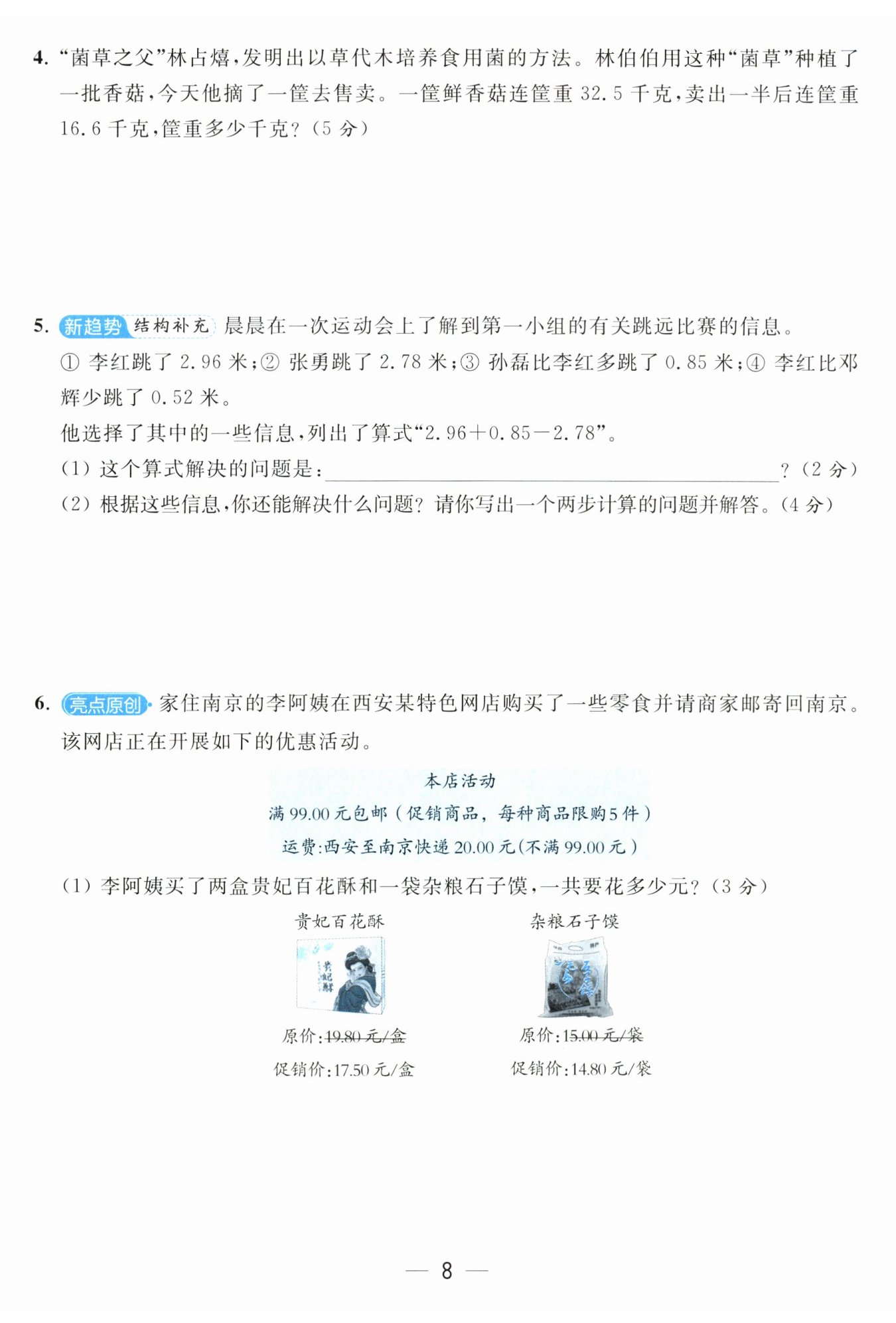 $17.5 + 17.5 + 14.8$ $= 35 + 14.8$ $= 49.8$(元) $49.8 < 99$ $49.8 + 20 = 69.8$(元) 答:一共要花69.8元。