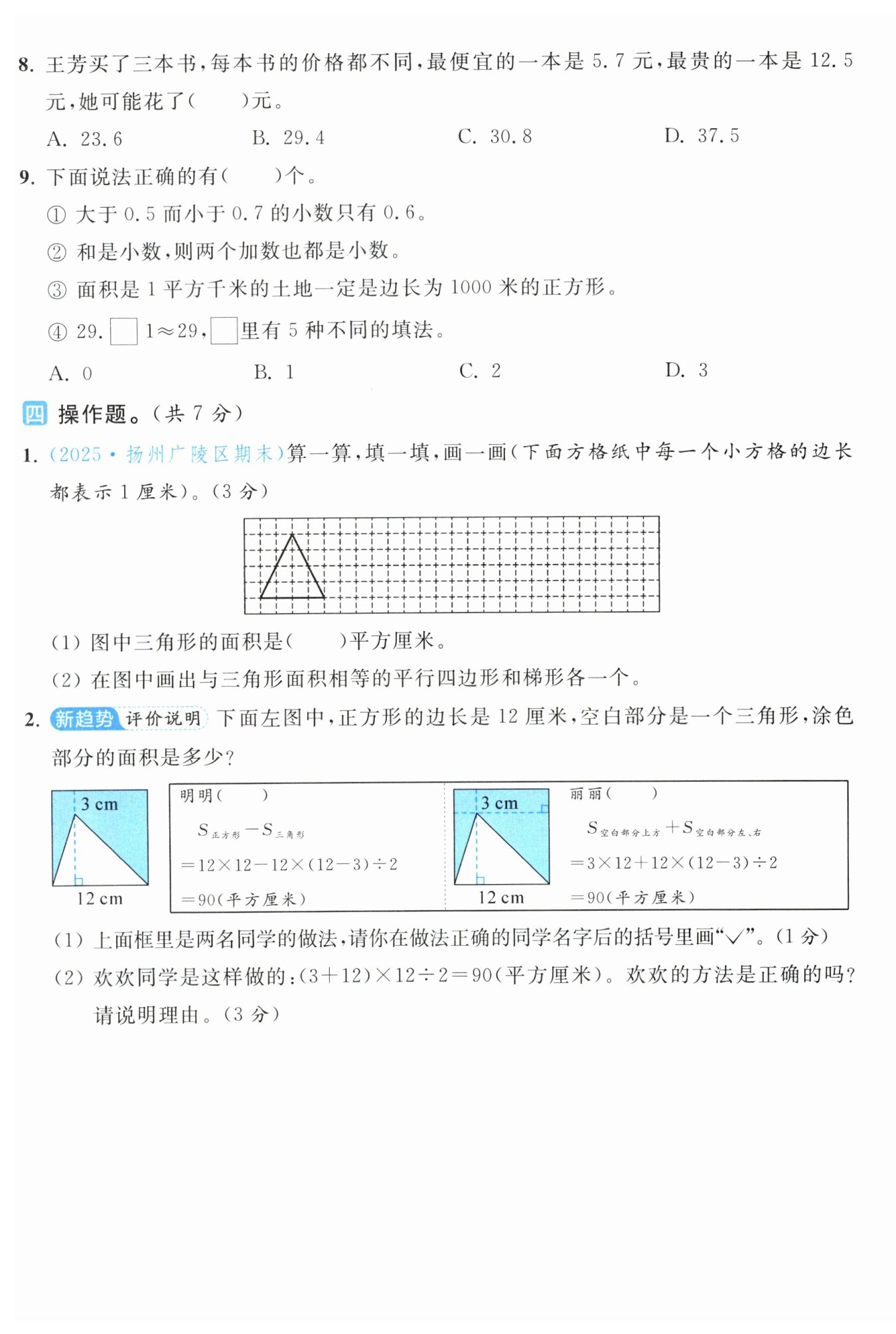 歡歡的方法是正確的。理由:假設(shè)左邊的梯形的高為$h_{1}$厘米,右邊的梯形的高為$h_{2}$厘米,則:$(3 + 12)×h_{1}÷2 + (3 + 12)×h_{2}÷2 = 15×h_{1}÷2 + 15×h_{2}÷2 = 15×(h_{1} + h_{2})÷2 = 15×12÷2 = 90$(平方厘米),所以歡歡的方法是正確的。