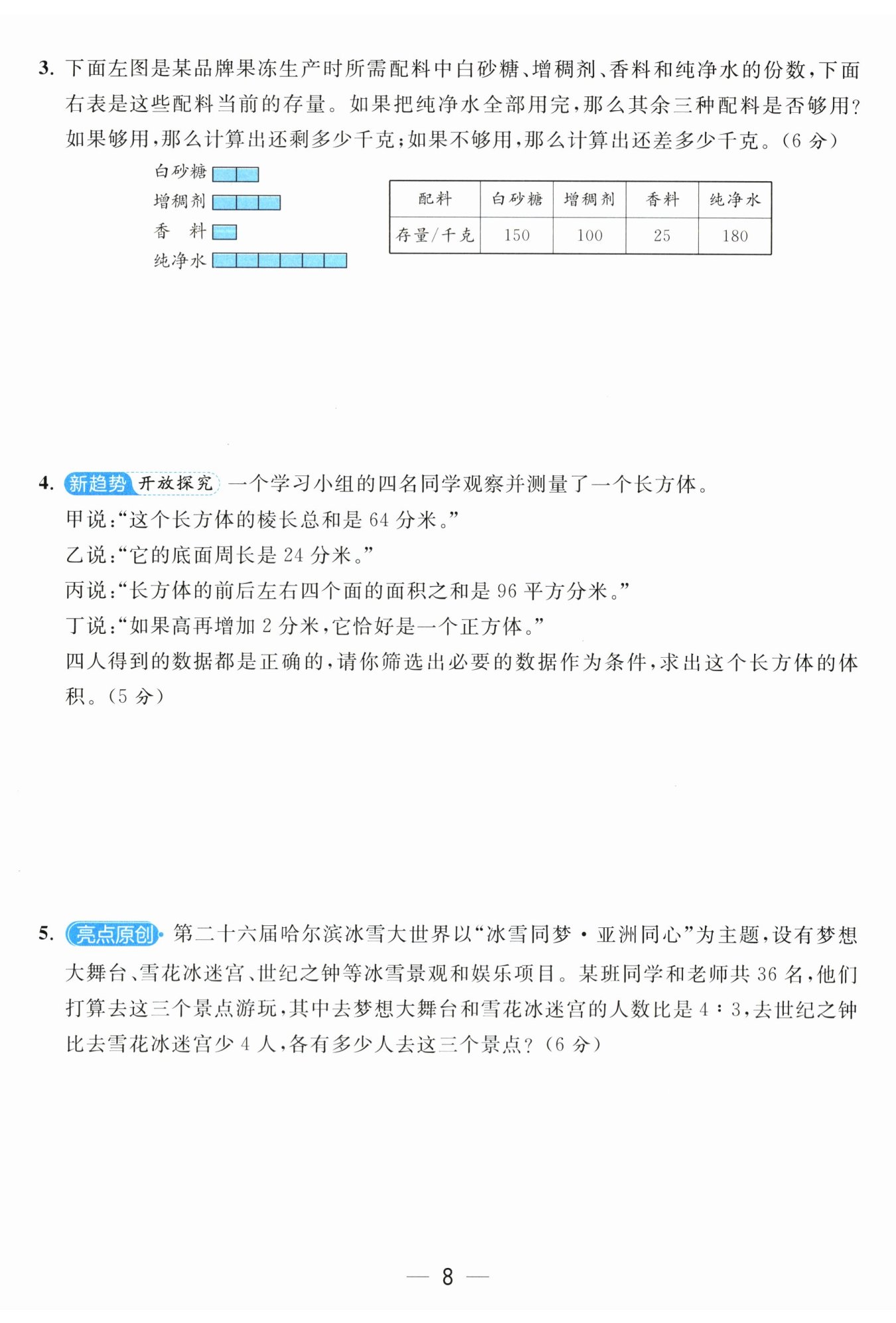 答:白砂糖和增稠劑夠用,香料不夠用。白砂糖還剩$90$千克,增稠劑還剩$10$千克,香料還差$5$千克。