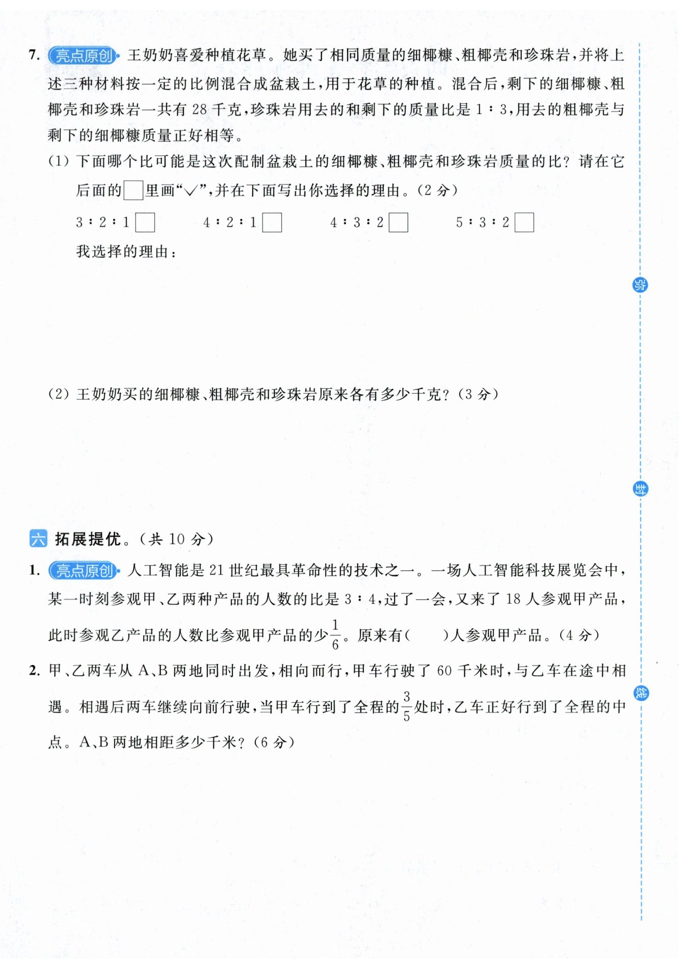 粗椰殼與細(xì)椰糖的份數(shù)的和正好是用去的珍珠巖份數(shù)的份數(shù)的 1+3=4倍,所以選 5:3:2。