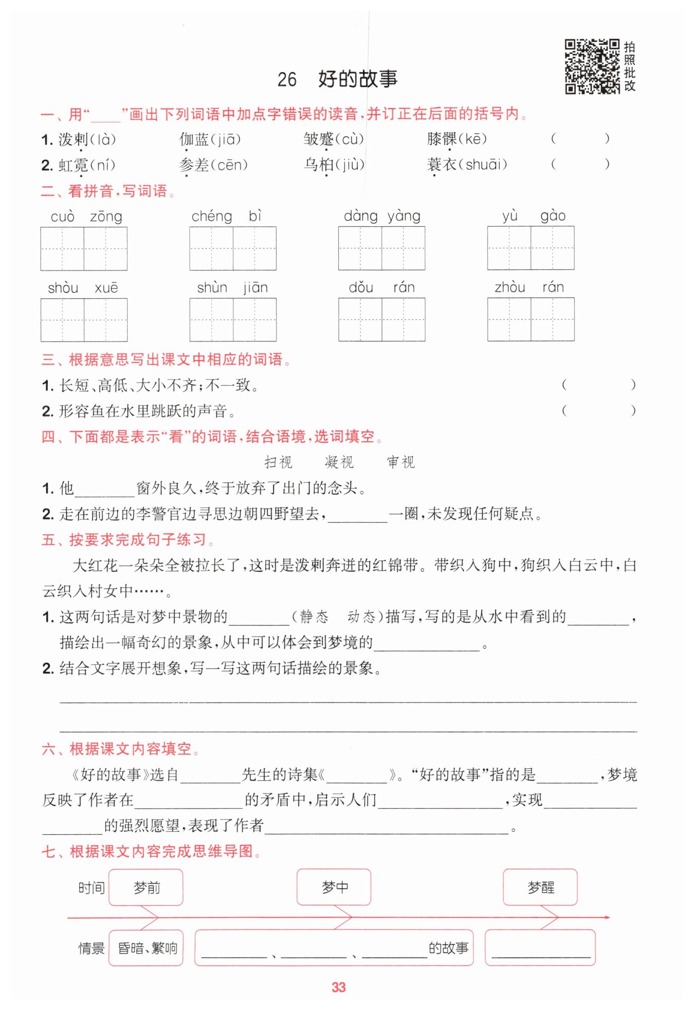 示例:一朵朵大紅花在水中的倒影變得很長(zhǎng),好像一條紅色的錦帶。紅花的倒影和狗
