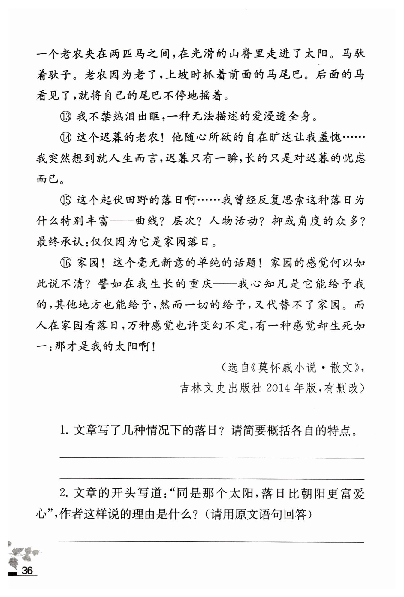 變;④大海落日,生分不遂意;⑤家園(田野、丘陵)落