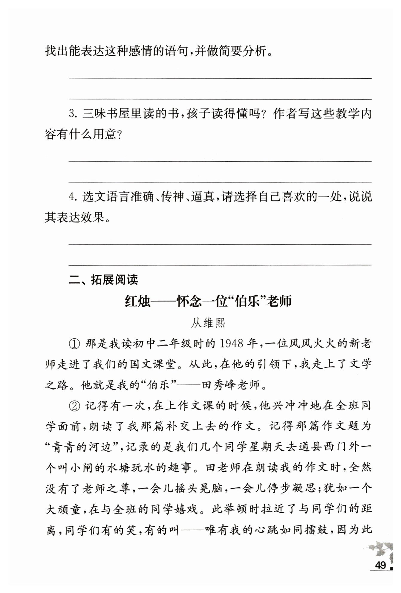瞪幾眼”,說(shuō)明先生比較開(kāi)明,他對(duì)學(xué)生是嚴(yán)而不厲,甚至是嚴(yán)而可親。先生讀書(shū)入神時(shí)“微笑”,“將頭仰起,搖著,向后面拗過(guò)去”等描寫(xiě),表現(xiàn)作者對(duì)先生的贊賞、尊敬,即使批評(píng)也是寓于幽默之中。