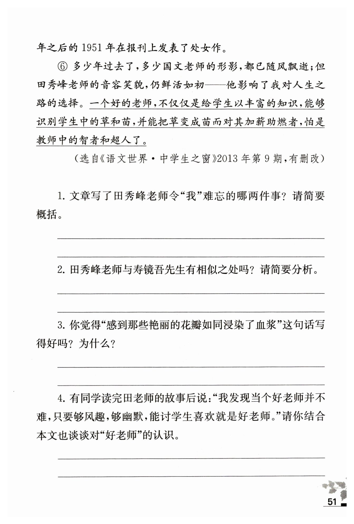 很平易近人。田老師在讀“我”的作文時,“全然沒有了老師之尊,一會兒搖頭晃腦,一會兒停步凝思;猶如一個大頑童,在與全班的同學(xué)嬉戲”;壽鏡吾先生讀書時,“總是微笑起來,而且將頭仰起,搖著,向后面拗過去,拗過去”。