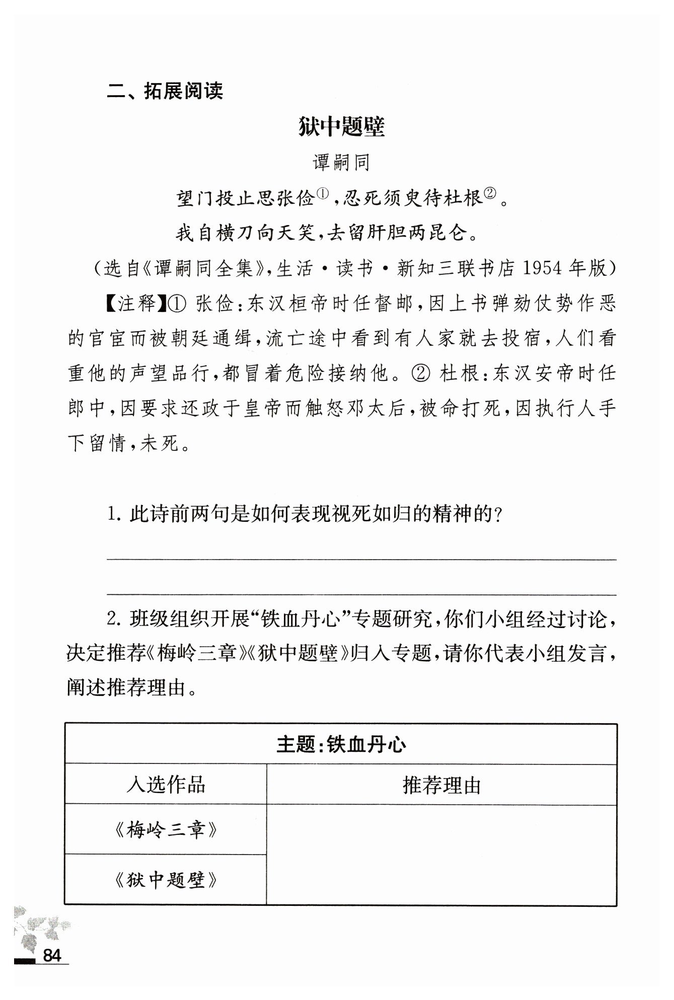 [示例]兩首詩都表現(xiàn)了為報效國家而舍生忘死的大無畏精神。如《梅嶺三章》中的“取義成仁今日事,人間遍種自由花”,《獄中題壁》中的“我自橫刀向天笑,去留肝膽兩昆侖”。