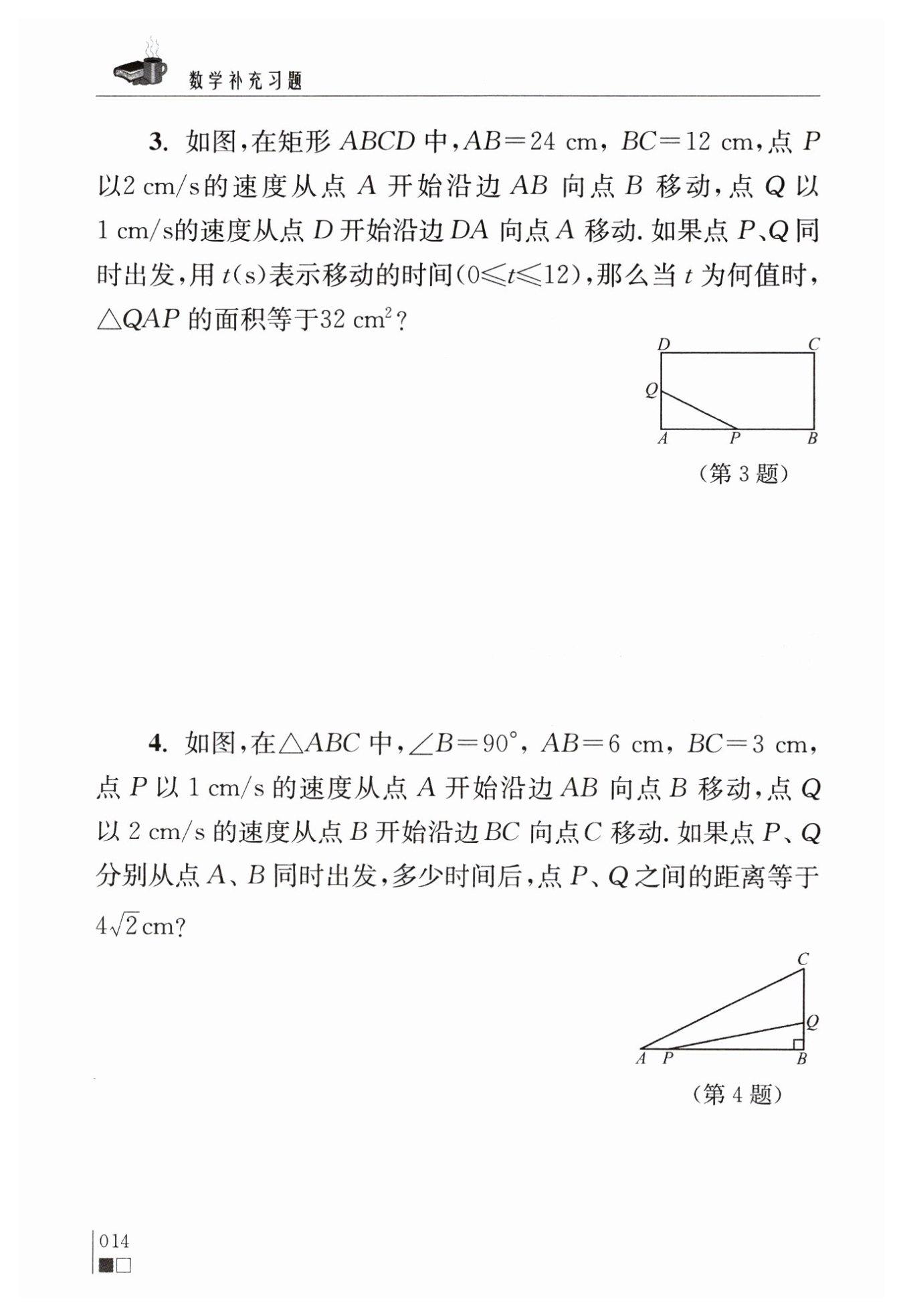 解:設(shè)?$ts $?后,點?$P,$??$Q $?之間的距離為?$ 4\sqrt 2\ \mathrm {cm}$?