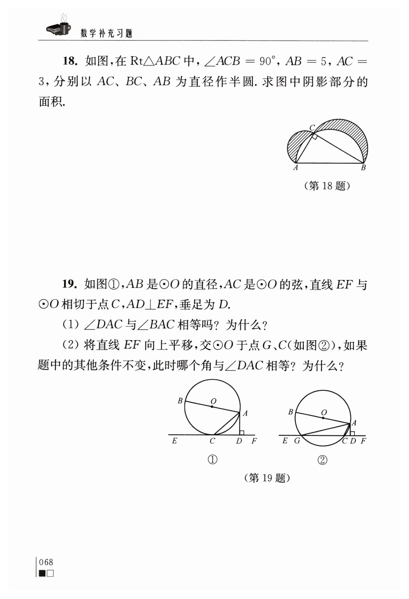 以$AC$為直徑的半圓面積$S_{1}=\frac{1}{2}\pi(\frac{AC}{2})^{2}=\frac{1}{2}\pi(\frac{3}{2})^{2}=\frac{9\pi}{8};$