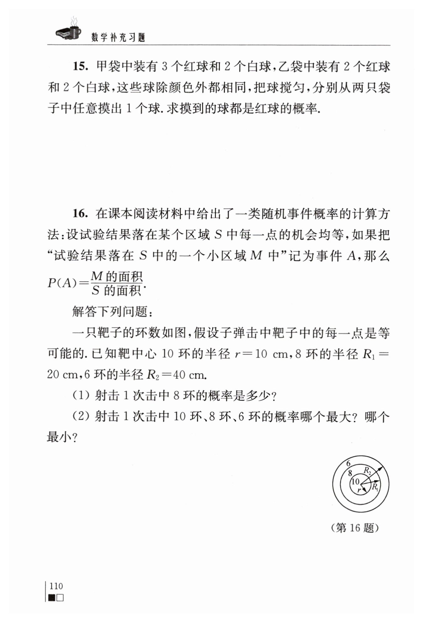 ?$(2)$?同上得?$ P($?擊中?$10$?環(huán)?$)= \frac 1{16},$??$P($?擊中?$6$?環(huán)?$)= \frac 34$?