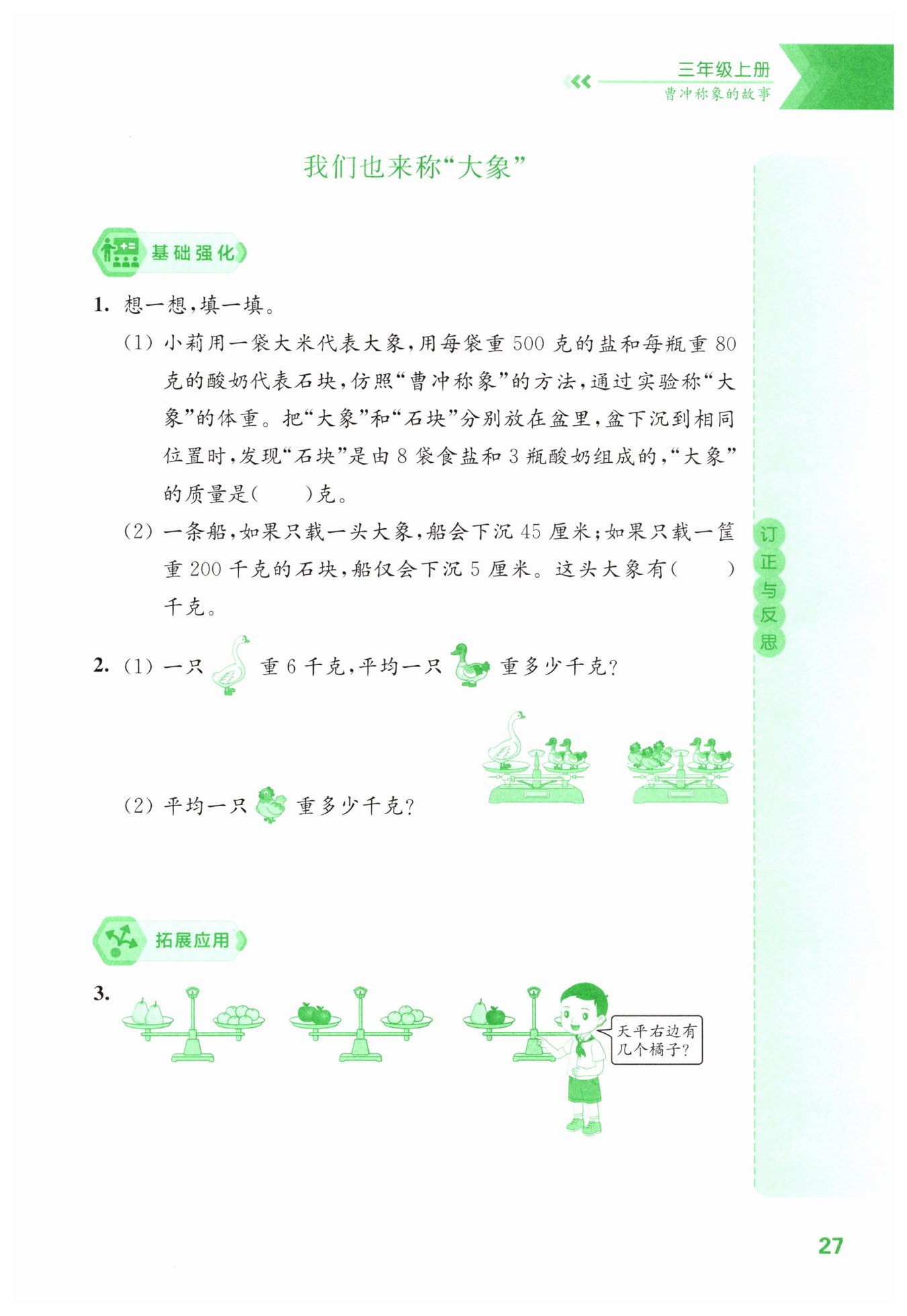 解:由圖可知$1$只鵝的質(zhì)量等于$2$只鴨的質(zhì)量,已知一只鵝重$6$千克,所以一只鴨重$6\div2 = 3$(千克)。