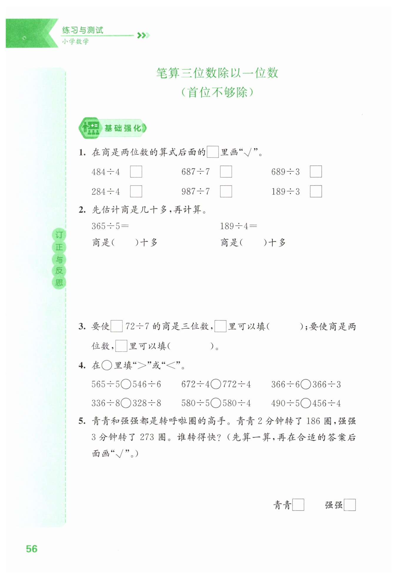 強強每分鐘轉(zhuǎn)的圈數(shù):$273\div3 = 91$(圈)