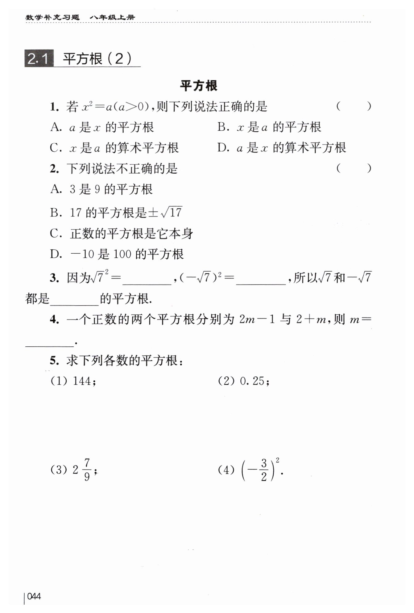解:$2\frac{7}{9}=\frac{25}{9},$因?yàn)?(\pm\frac{5}{3})^2=\frac{25}{9},$所以$2\frac{7}{9}$的平方根是$\pm\frac{5}{3}。$