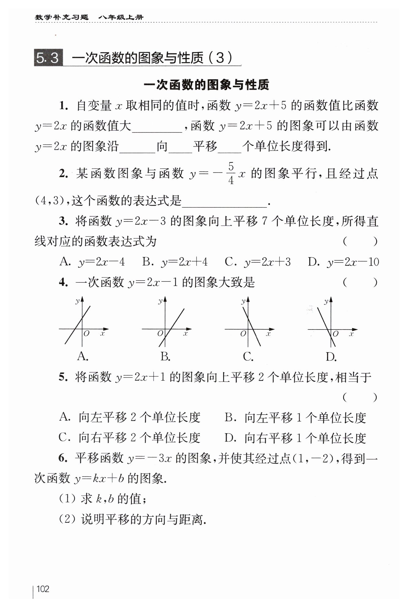 ?$ (2)$?原函數(shù)?$y = -3x,$?平移后函數(shù)為?$y = -3x + 1$?