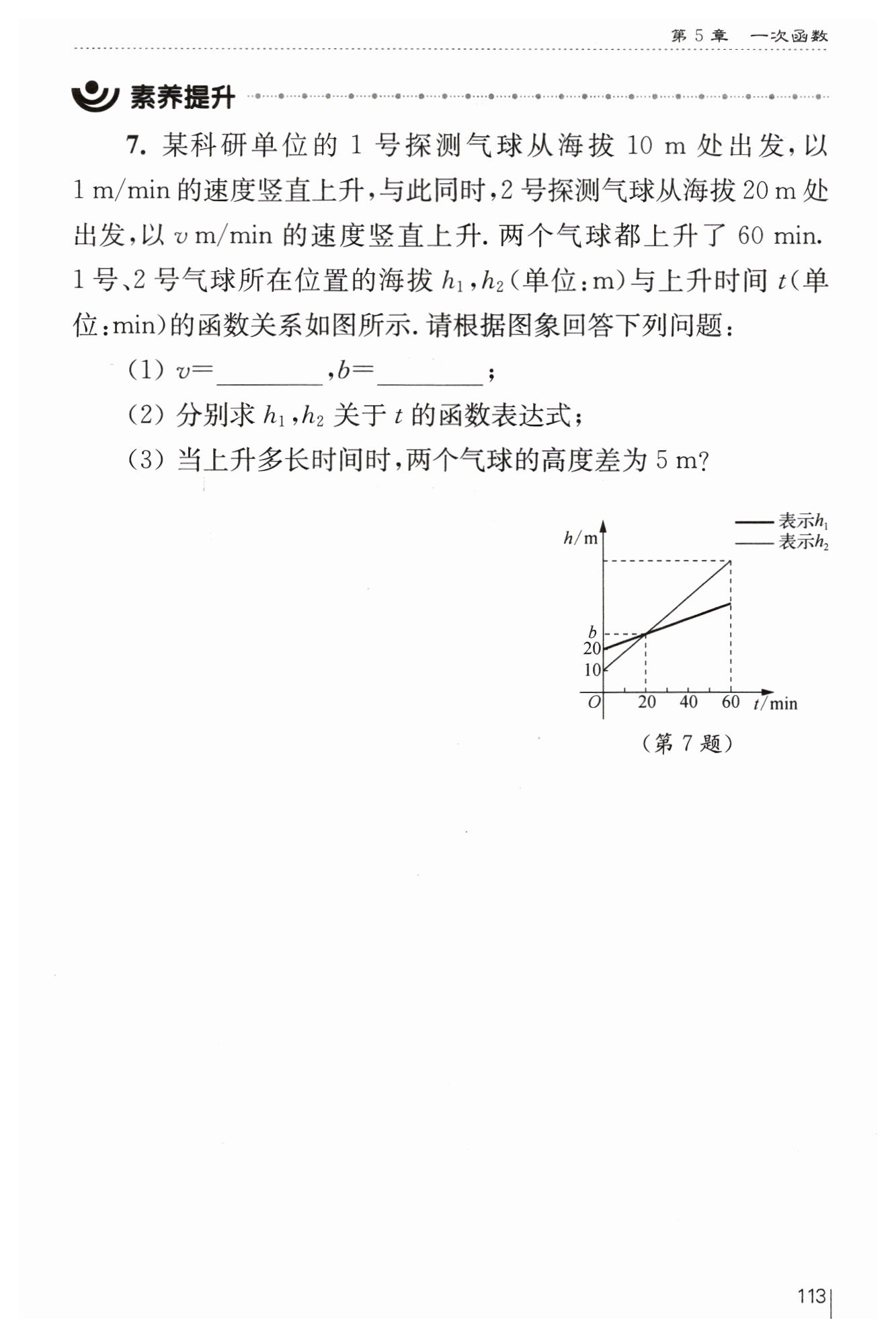當(dāng)?$h_{2}-h_{1}=5$?時(shí),?$(20 + 0.5\ \mathrm {t})-(10 + t)=5,$?解得?$t = 10$?