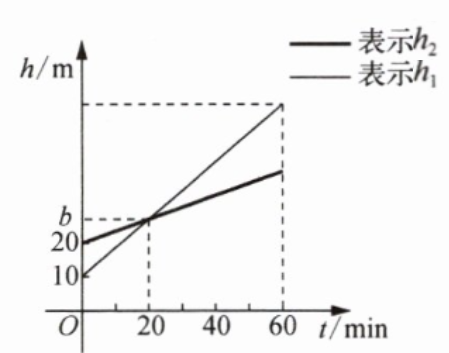 解:?$(2)h_{1}=10 + t(0\leq t\leq 60),$??$h_{2}=20+0.5\ \mathrm {t}(0\leq t\leq 60)$?