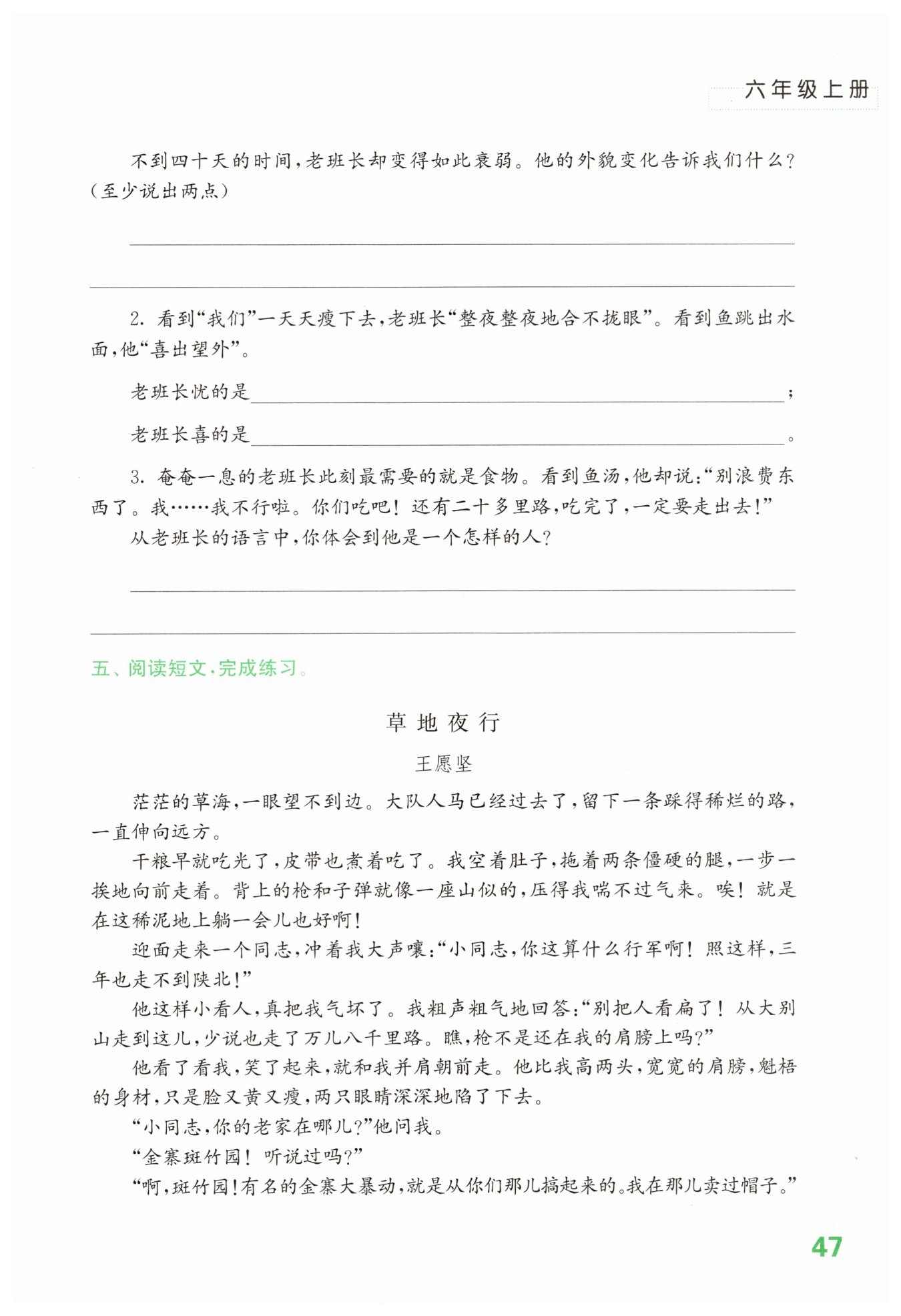 (1)草地行軍的生活非常艱苦。(2)老班長(zhǎng)為了照顧“我們”,睡不好,吃