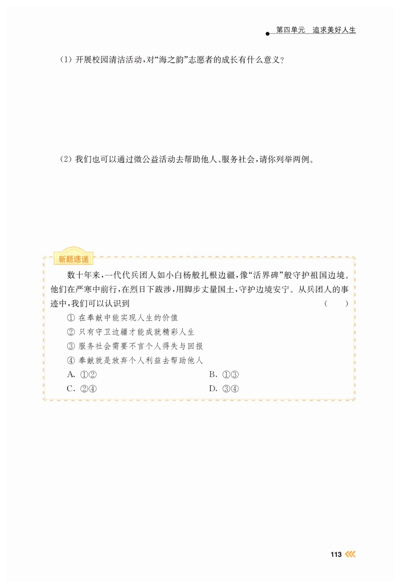 實(shí)現(xiàn)自身的人生價(jià)值。②志愿者通過辛勤的勞動(dòng)扮靚了校園,