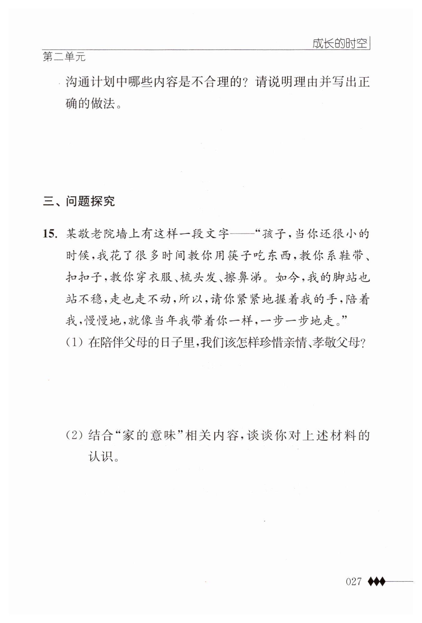 家是我們身心的寄居之所,也是我們心靈的港灣。材料中體現(xiàn)出父母在我們小時(shí)候精心呵護(hù)我們成長(zhǎng),當(dāng)父母年老時(shí),我們也應(yīng)該像他們當(dāng)年對(duì)待我們那樣,陪伴、照顧他們。家的溫暖和親情,需要我們?cè)谂c家人的相互陪伴、相互關(guān)愛(ài)中去感受和維系,父母與子女之間這種雙向的愛(ài)與陪伴,正是家的意味的重要體現(xiàn)。
