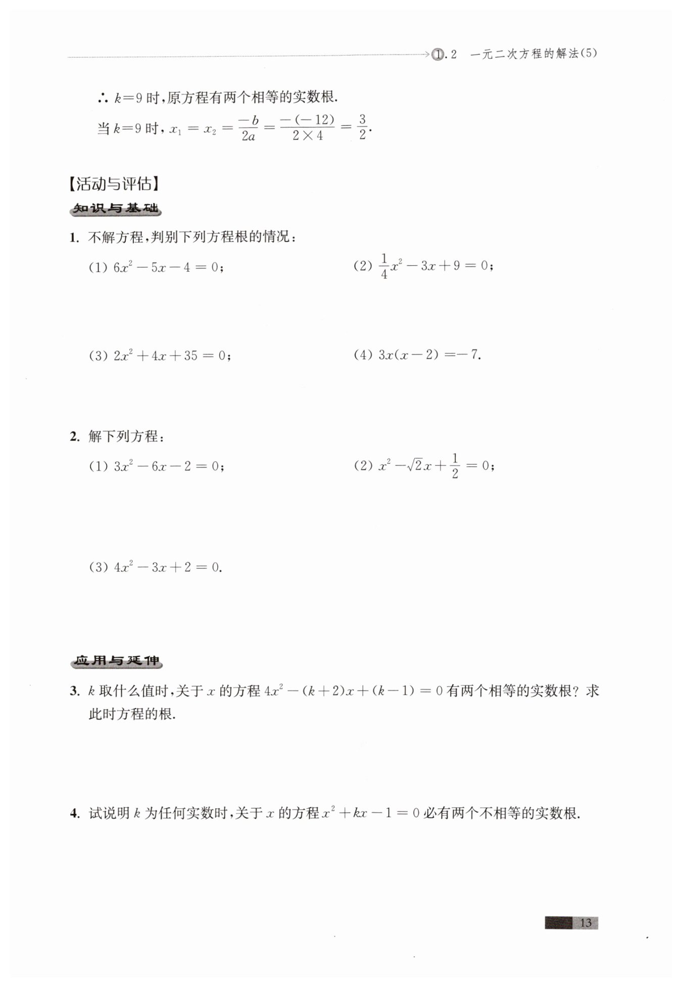 當(dāng)?$k=10$?時,方程為?$4x^2-12x+9=0,$?即?$(2x-3)^2=0$?