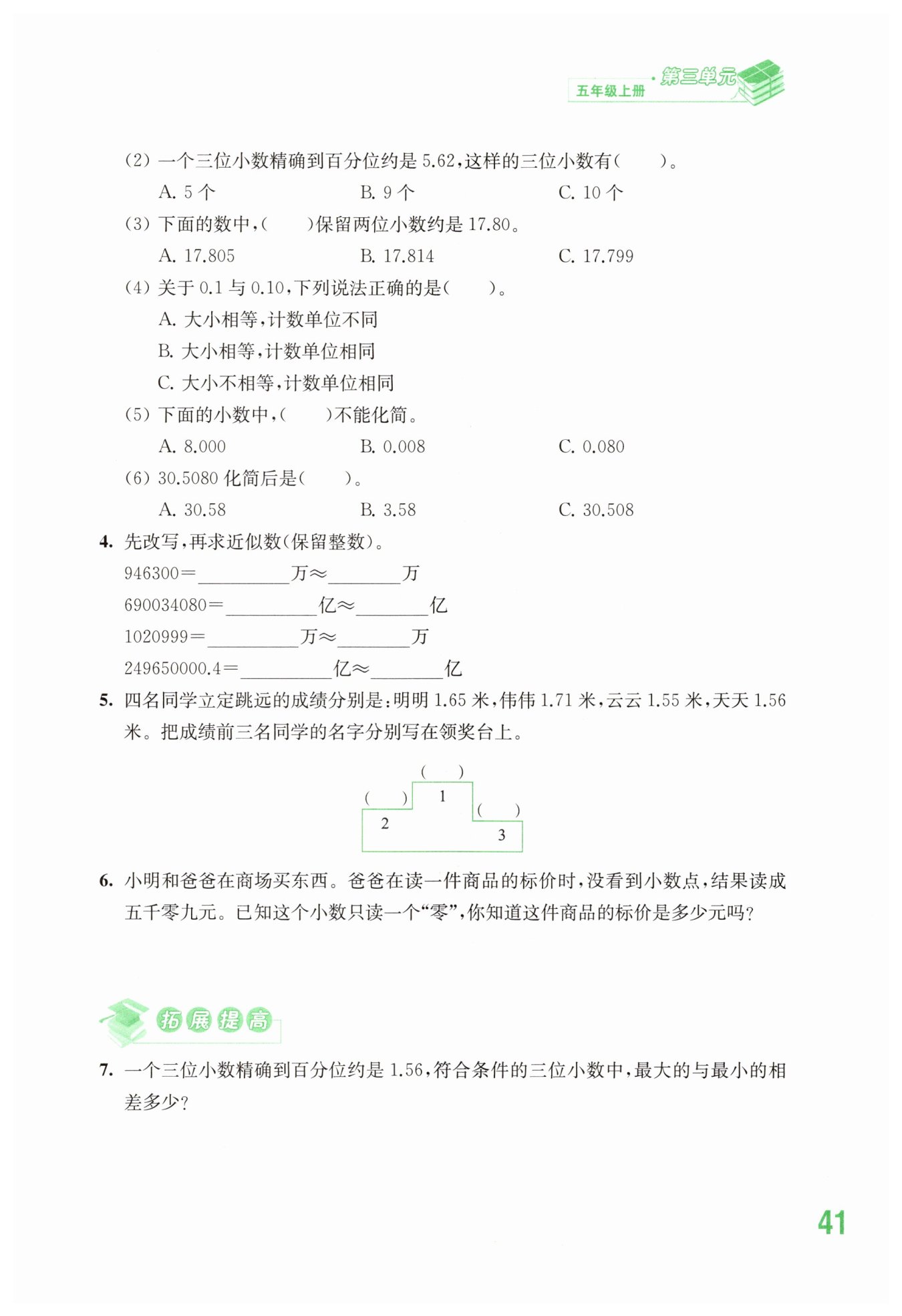 五千零九寫作5009,添上小數(shù)點后只讀一個“零”的小數(shù)為50.09。